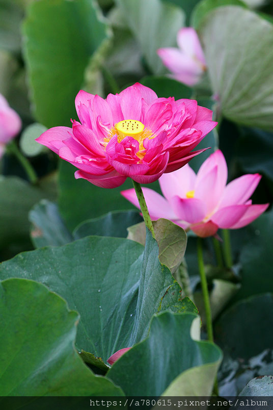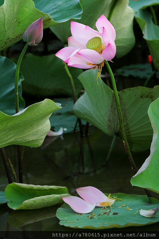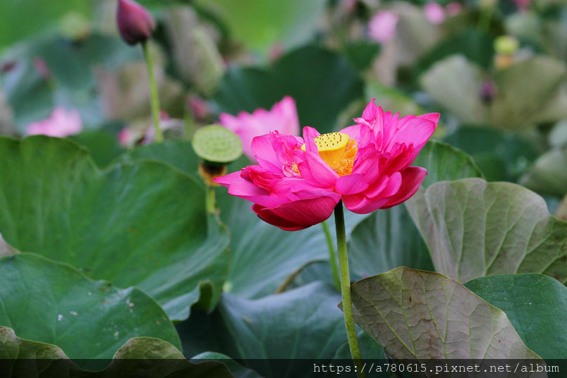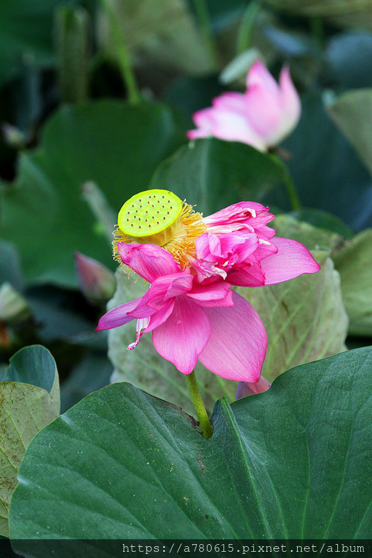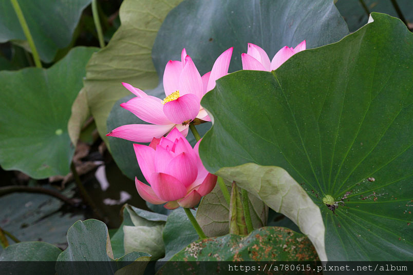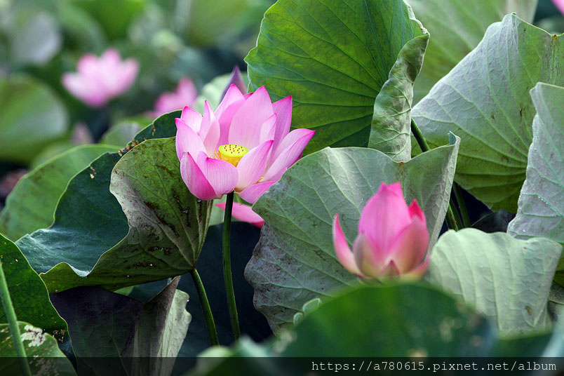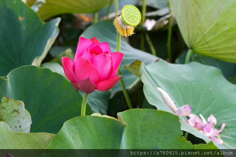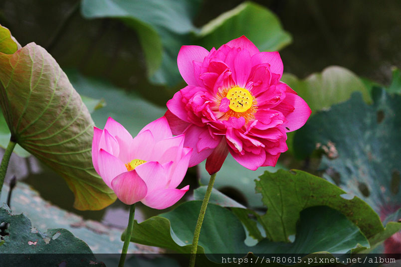 水邊開徹芙蓉,兩個品種的荷花互相競艷,荷葉的伸張捲曲,荷花