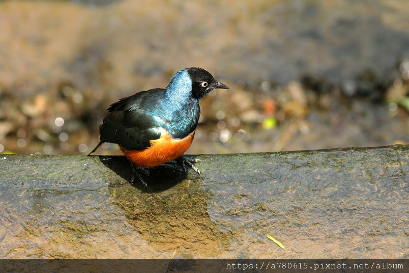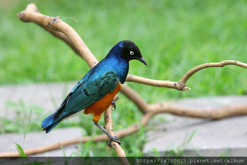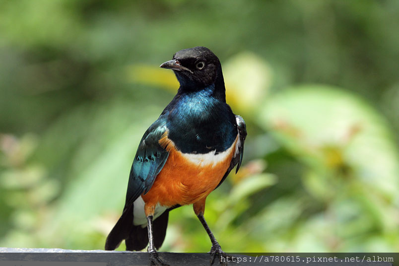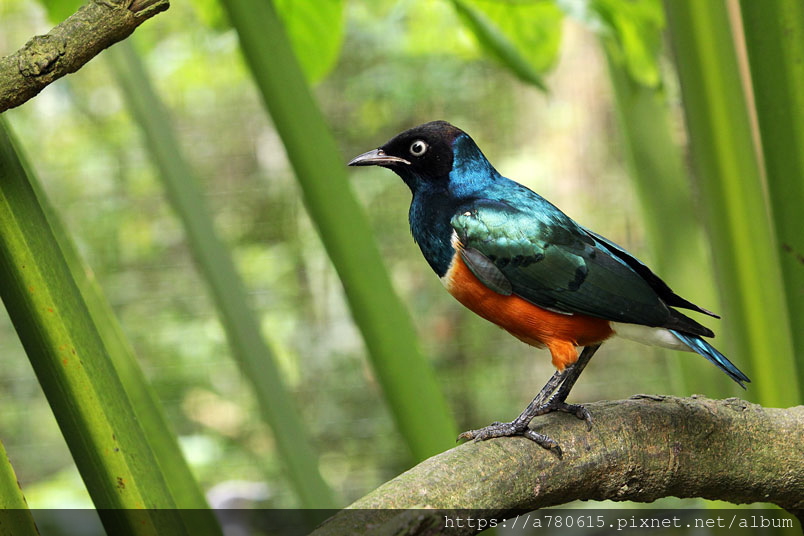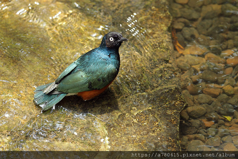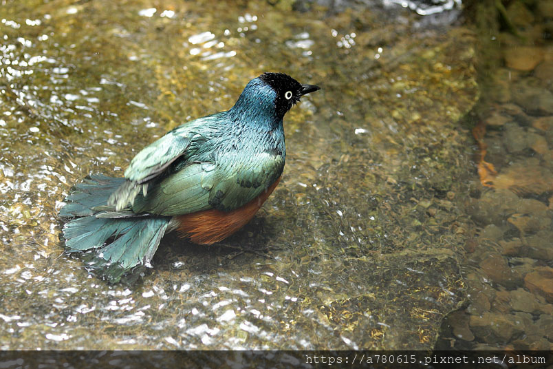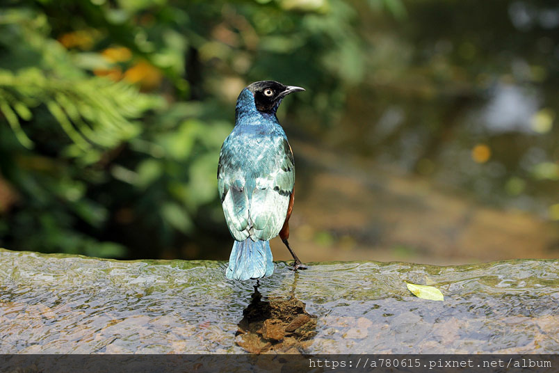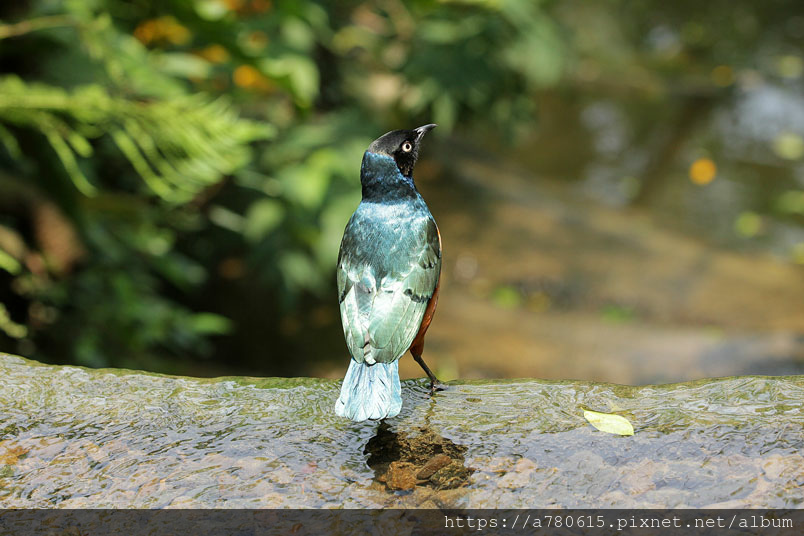 栗頭麗椋鳥,長約18cm,頭黑色,胸、背及翅膀為藍色及藍綠色的混