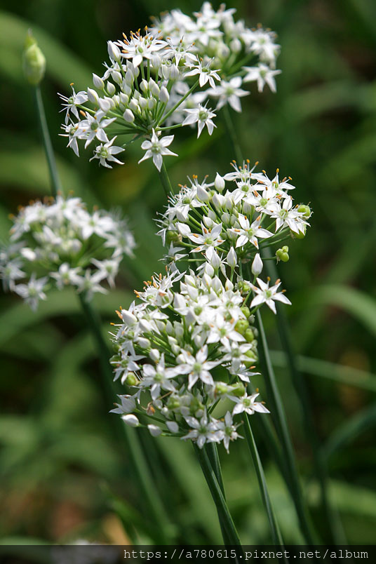 白色花朵點綴在翠綠的梗上,遠看就好像綠油油的田地被白雪