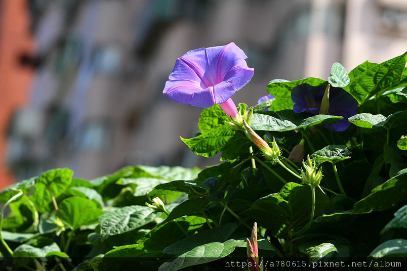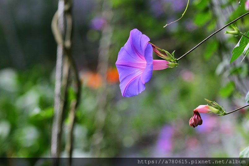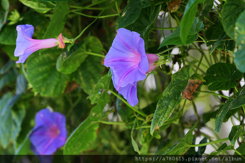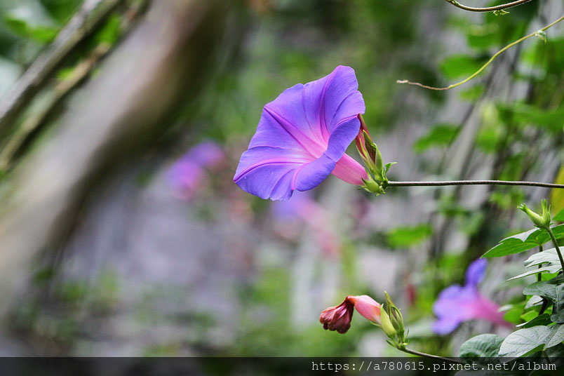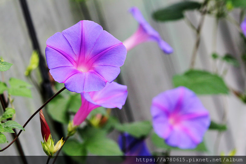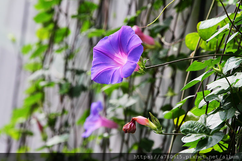 牽牛花盛著清晨的露水,於剎那間綻放,攀爬於牆垣和籬笆之間,
