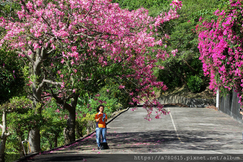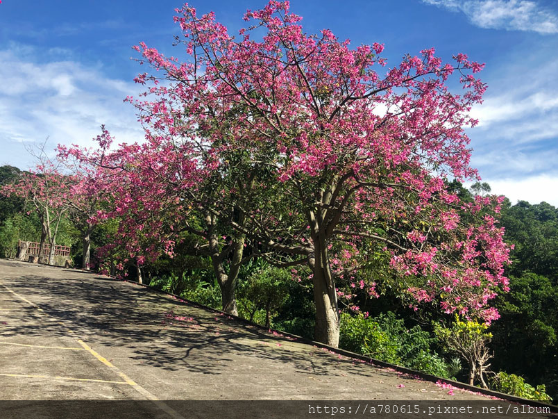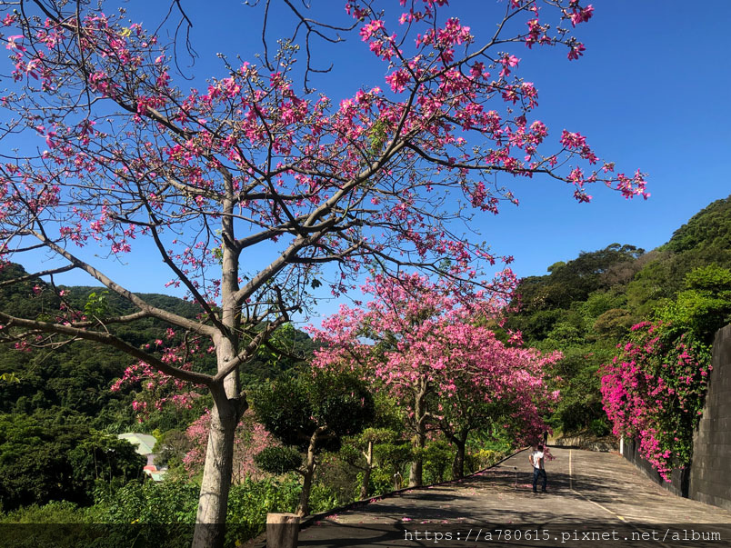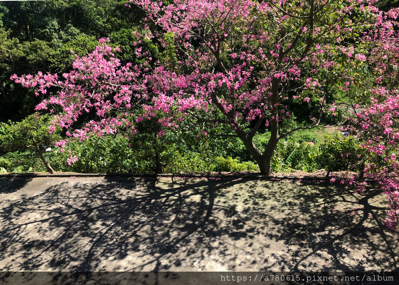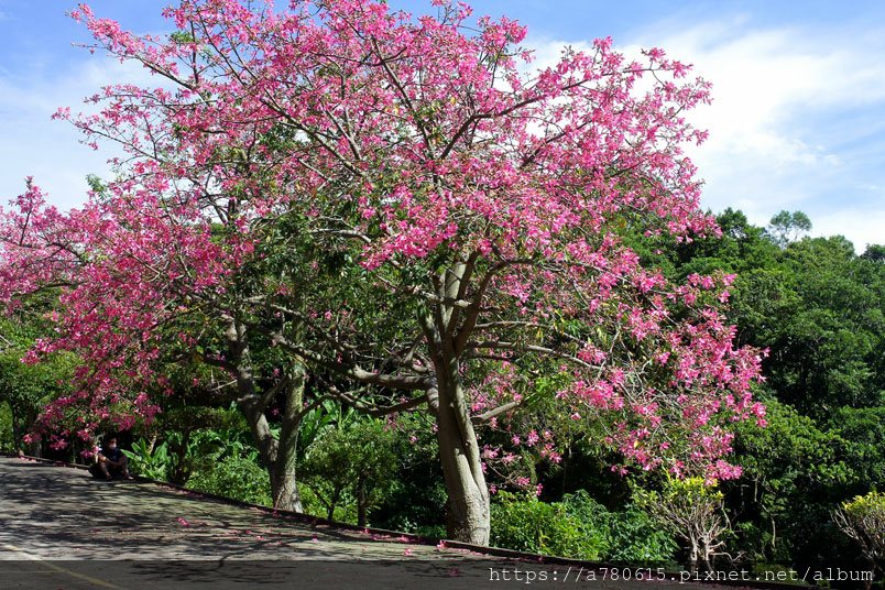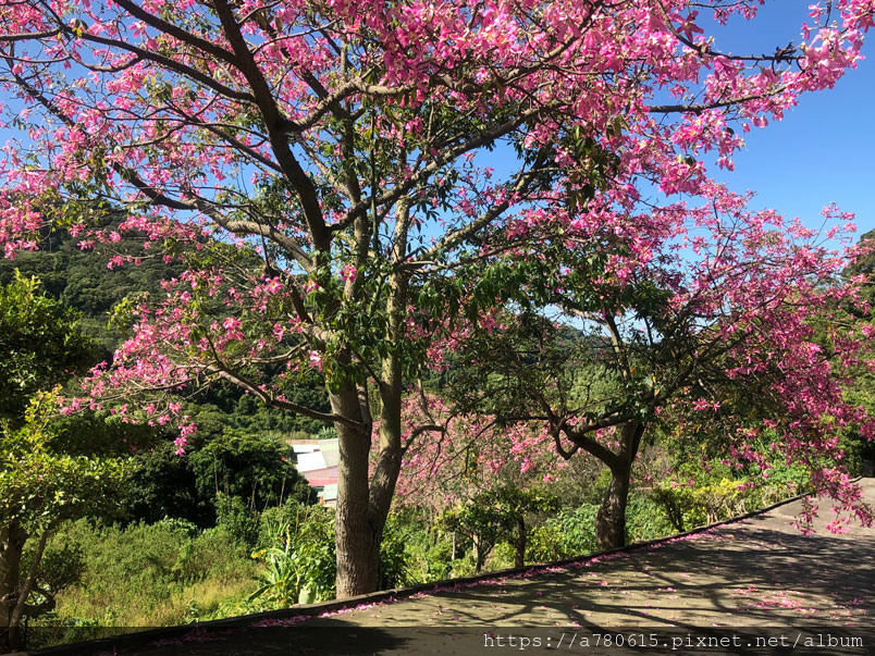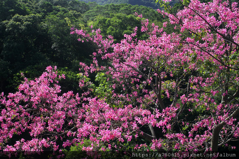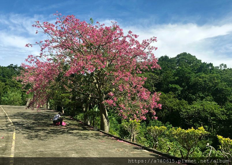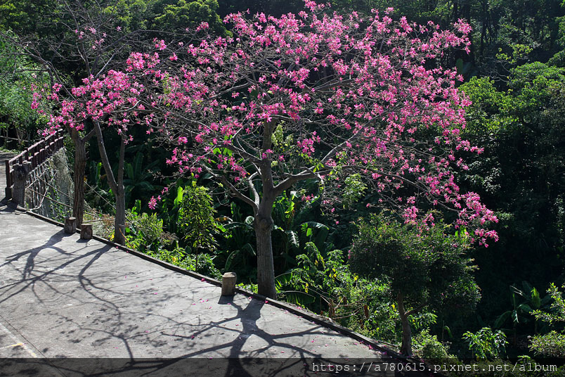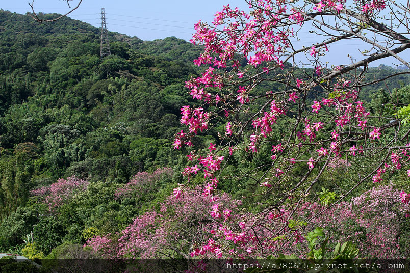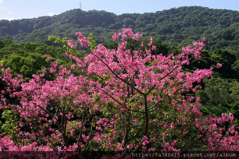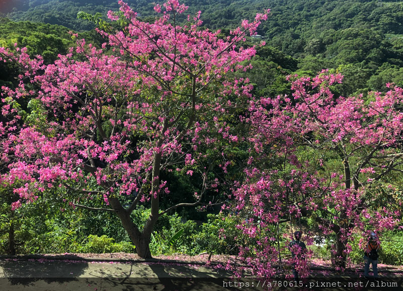 位在桃園龜山的大棟山登山步道,有開滿桃紅色花的美人樹數棵