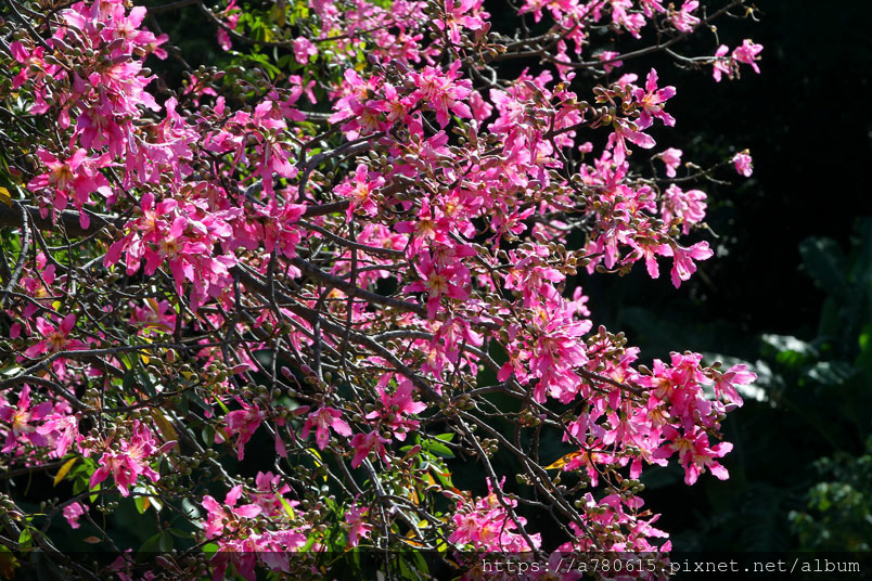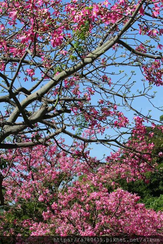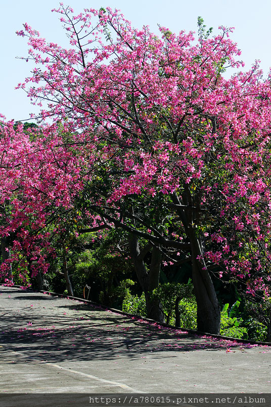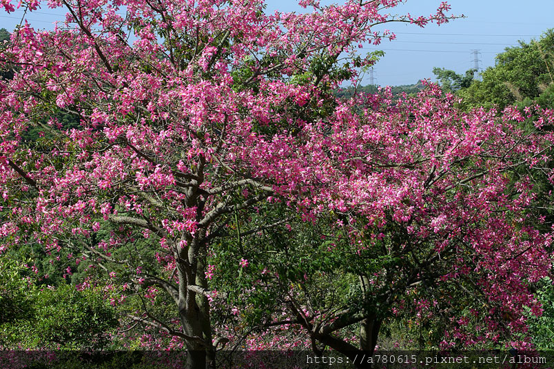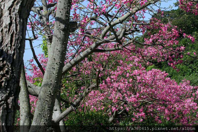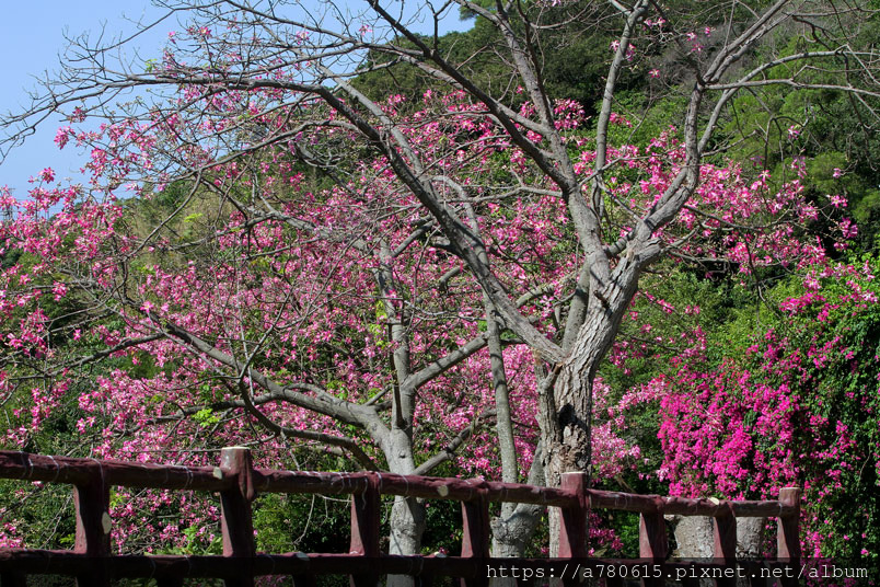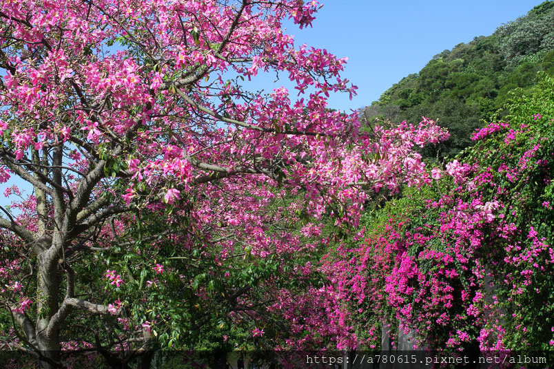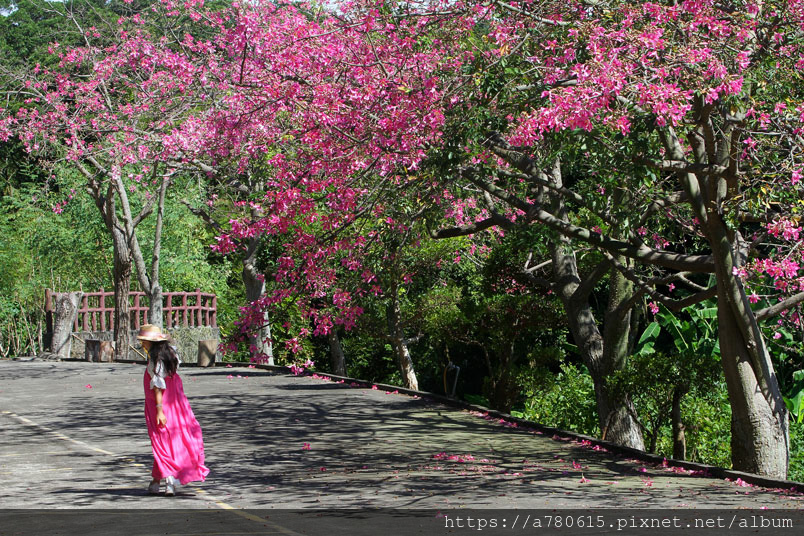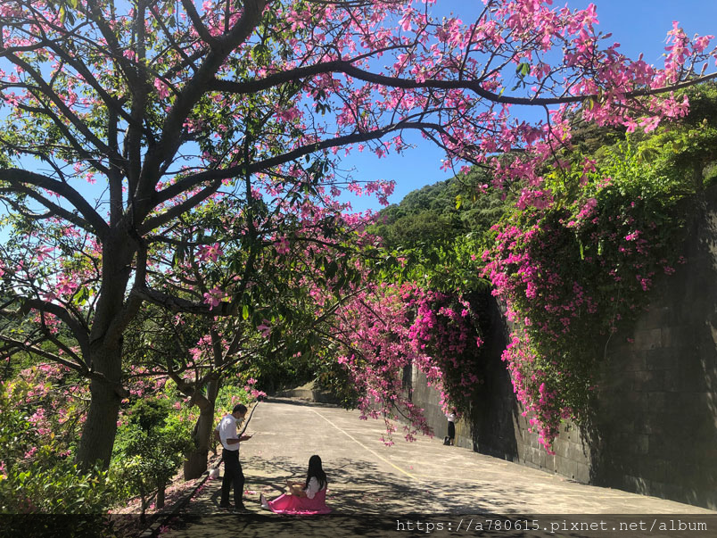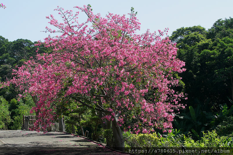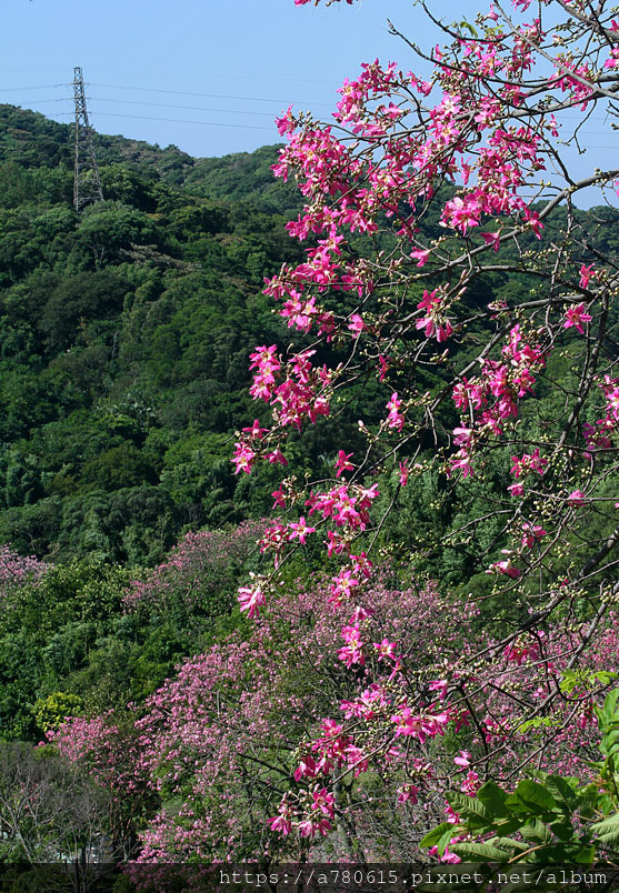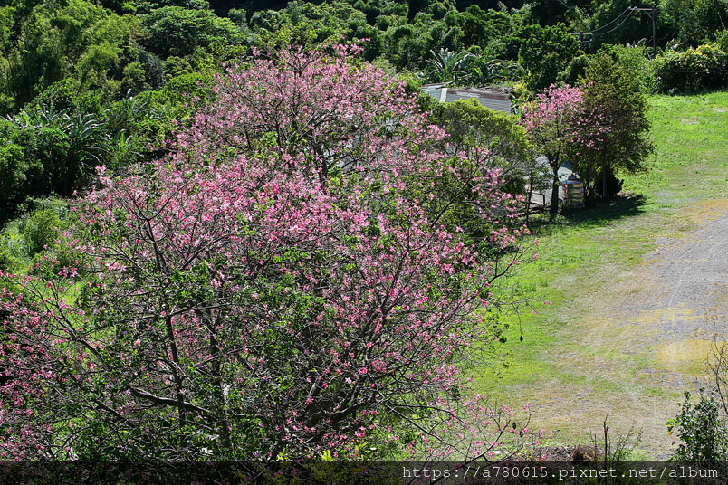 位在桃園龜山的大棟山登山步道,有開滿桃紅色花的美人樹數棵
