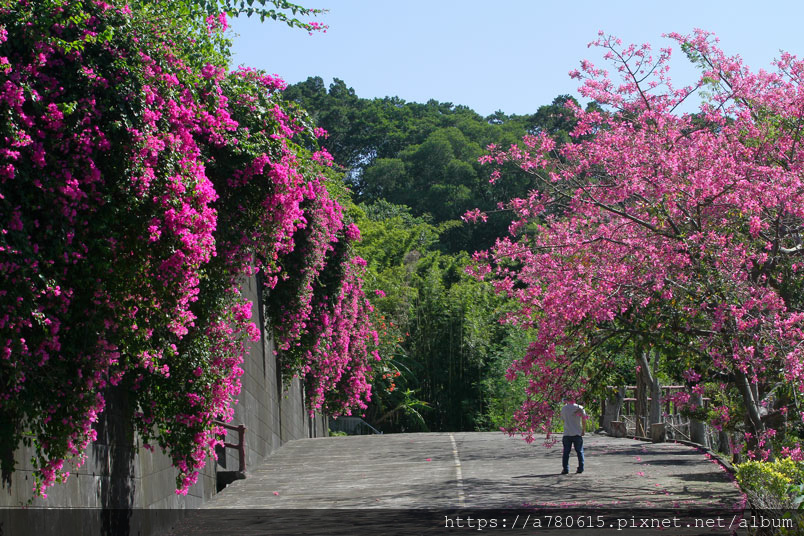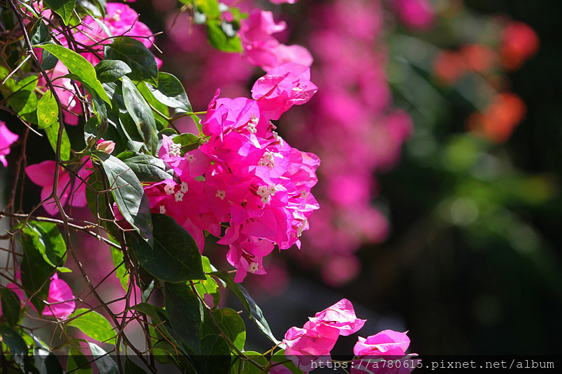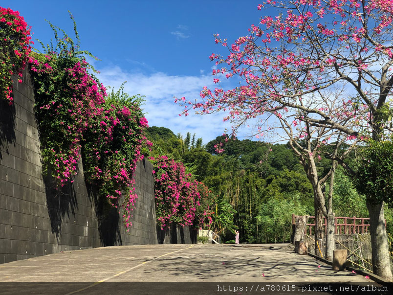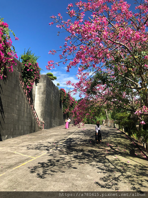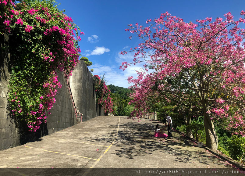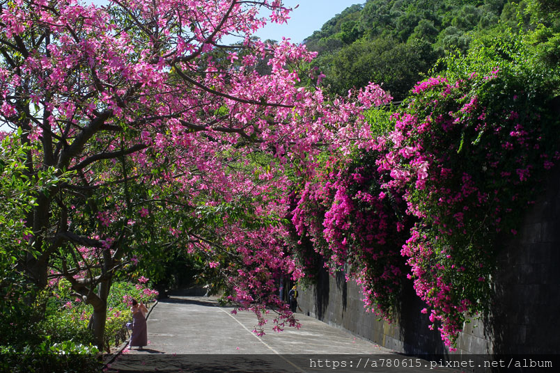 ,花多且豔麗,加上一旁的高牆上也有密集盛開的九重葛,雙重