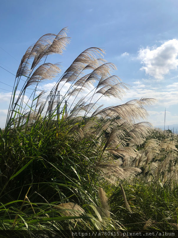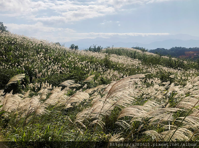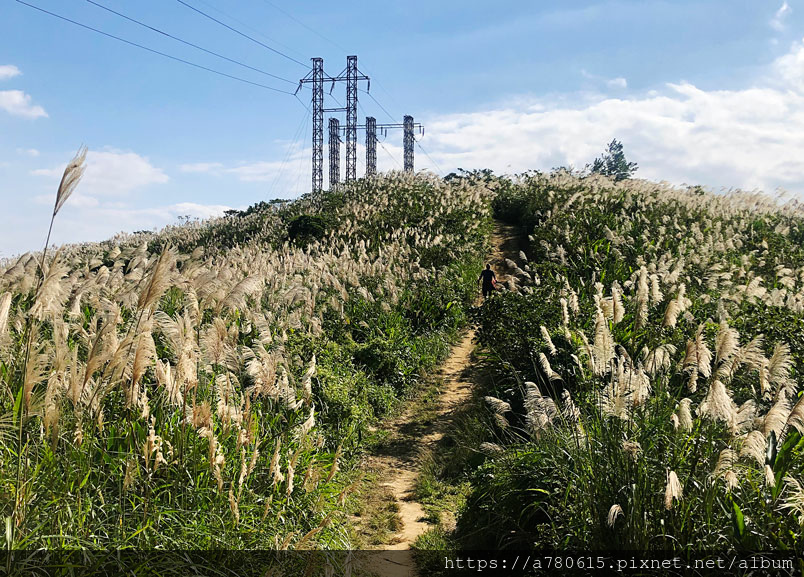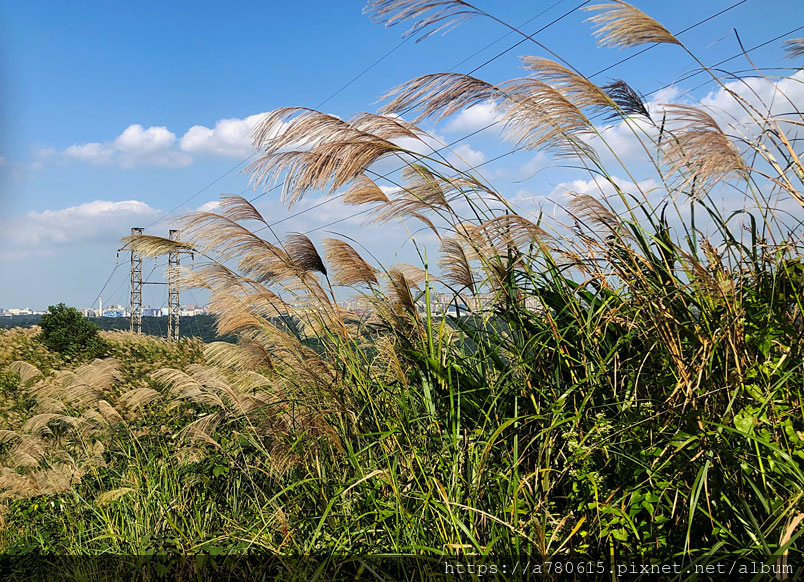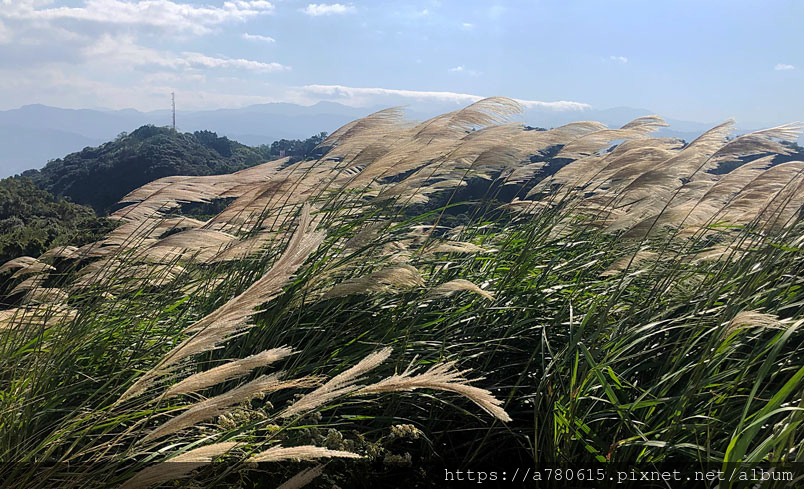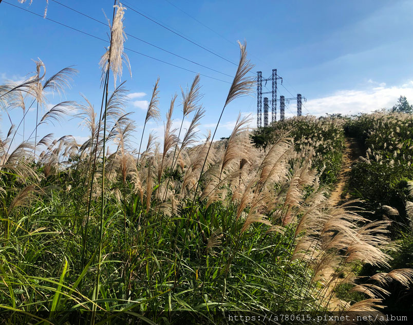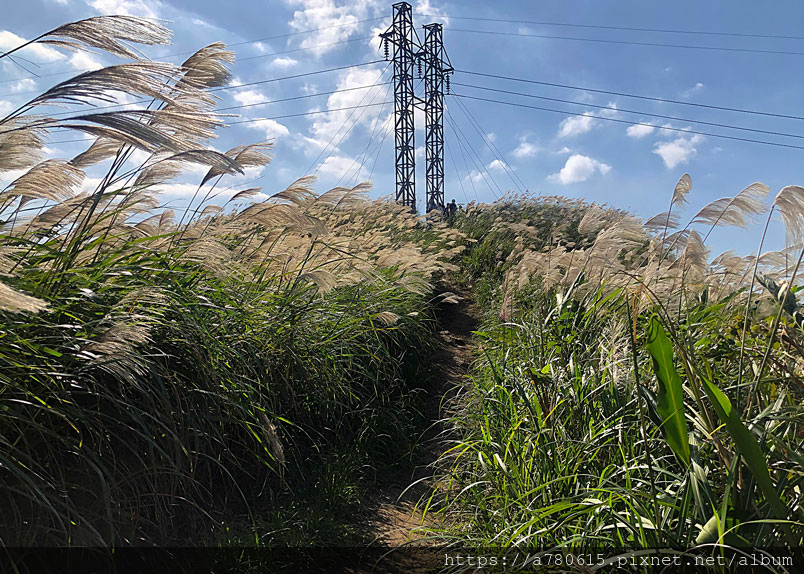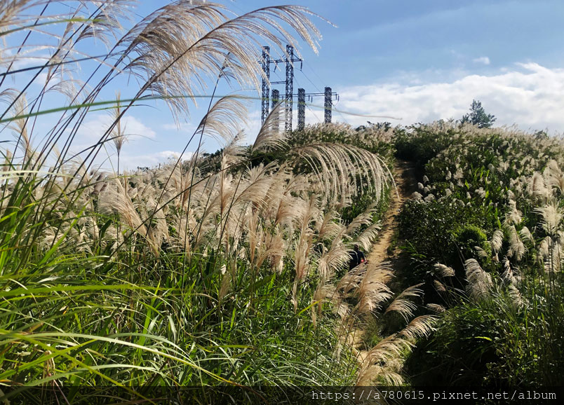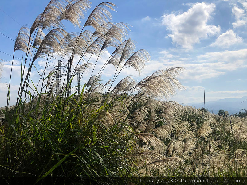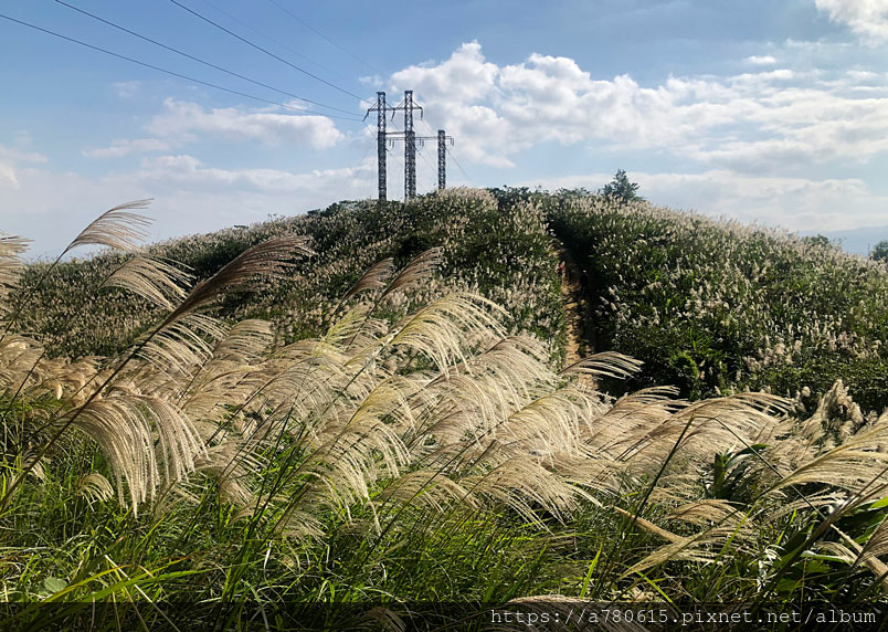 一整片的芒草盛開,搭配藍天白雲、遠處的山嵐和電塔,有種夢