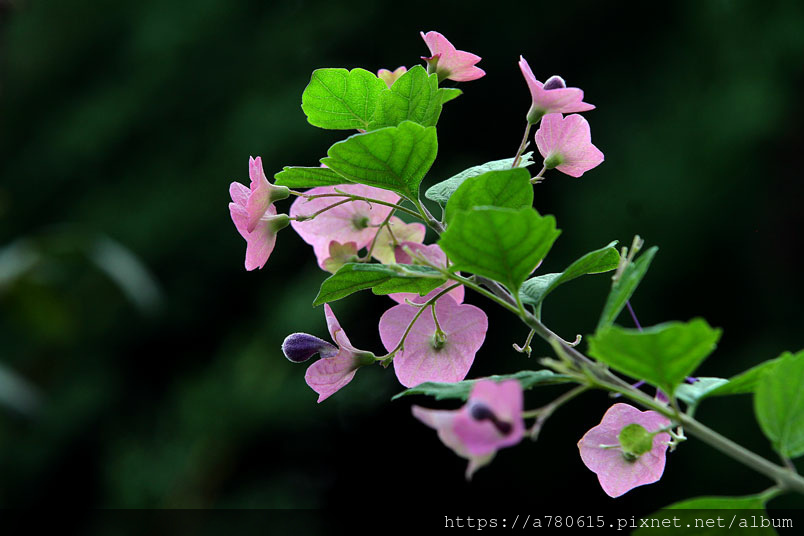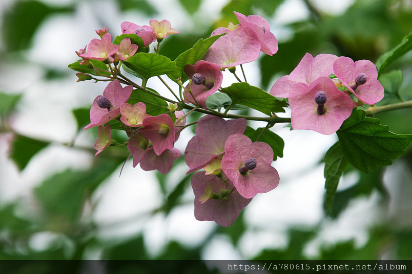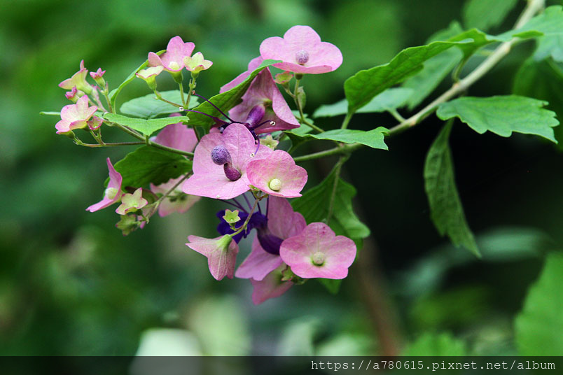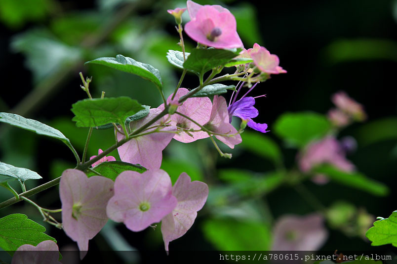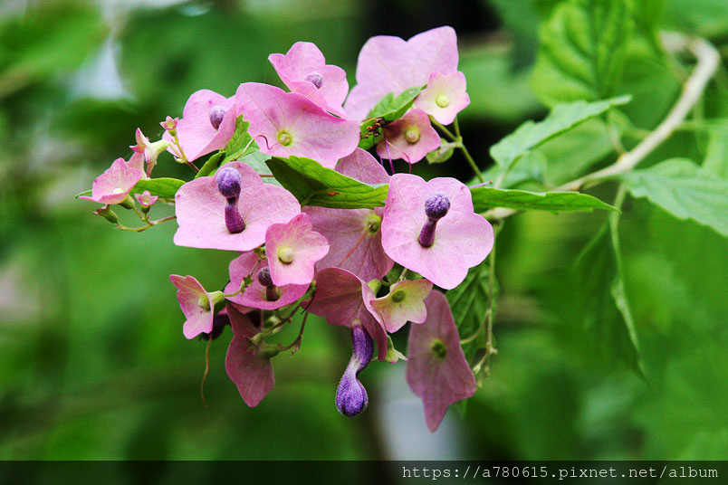 花形奇特的粉紅色花萼上,開著形似蝴蝶翩翩飛舞的紫色花,姿態