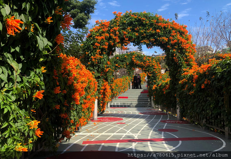 為人津津樂道的就是彩繪炮仗花拱門花廊步道。今年與臺灣藝術