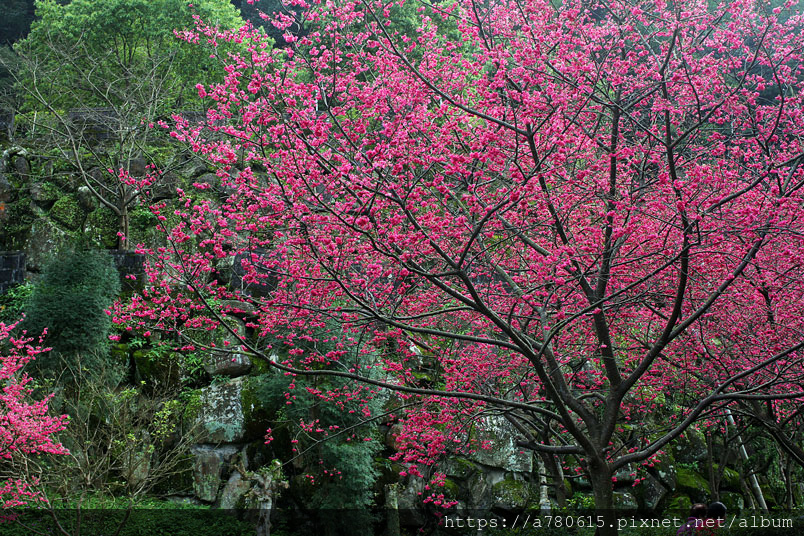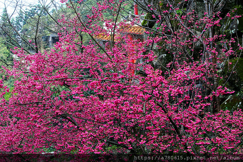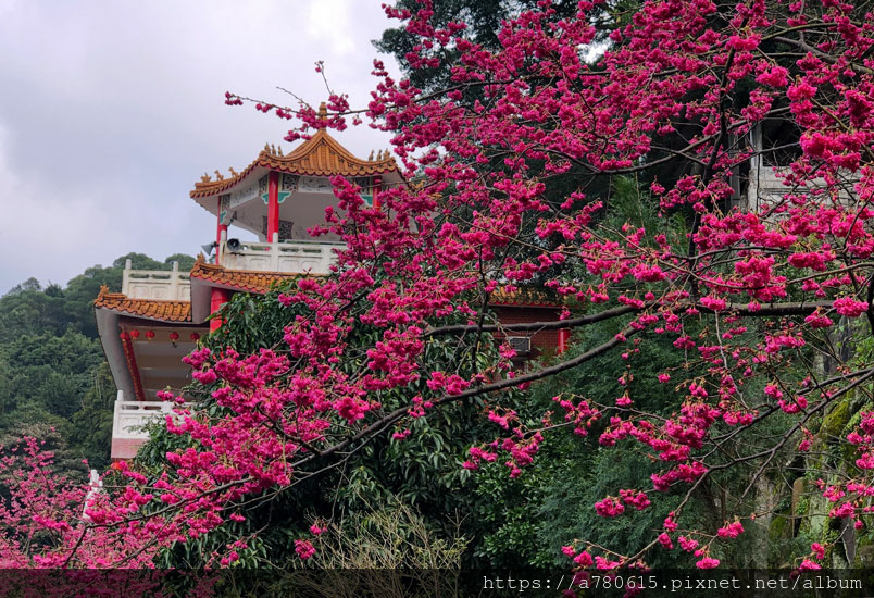 今年因為天候關係,櫻花提前10天開放。莊嚴的廟宇,有櫻花掩