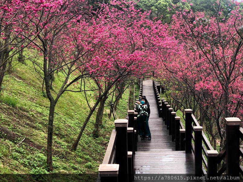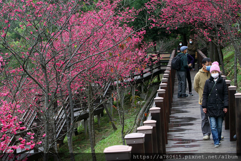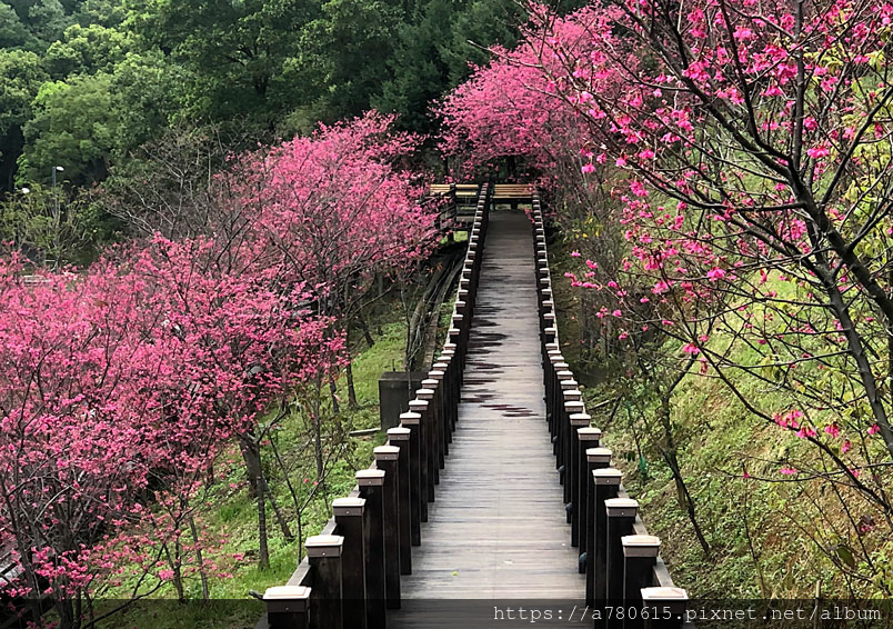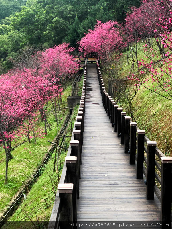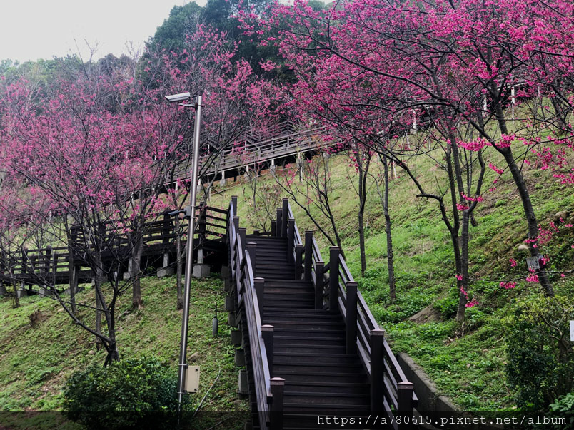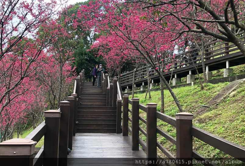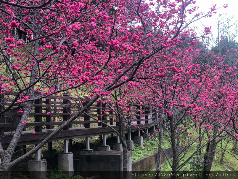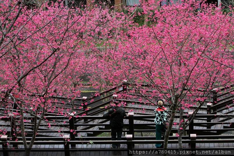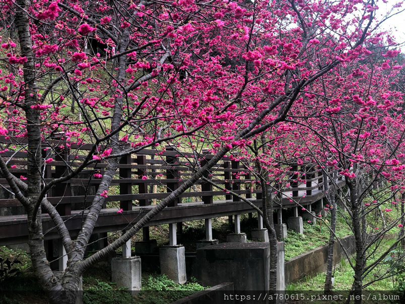 櫻花搭配木棧道的景觀,相當美麗。雖然天候不佳,仍就按了