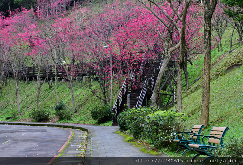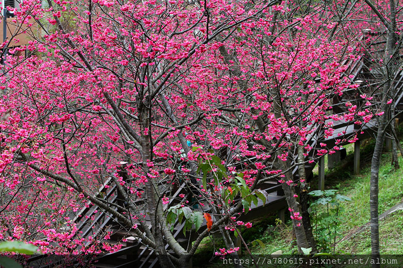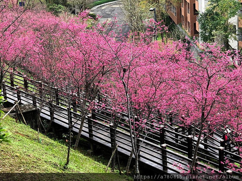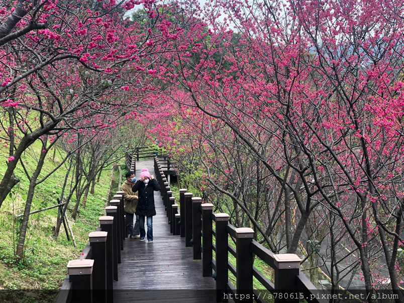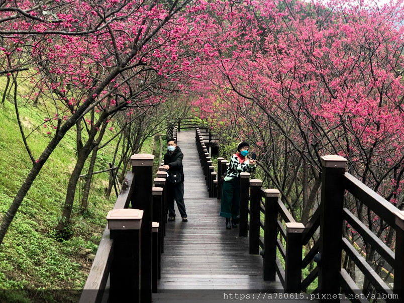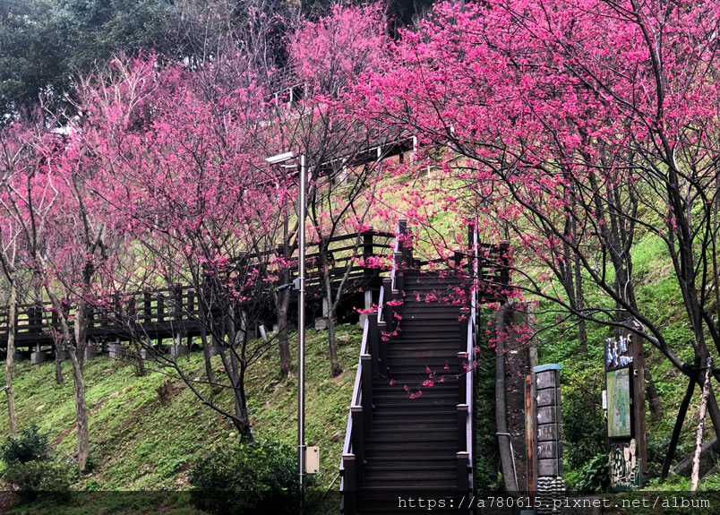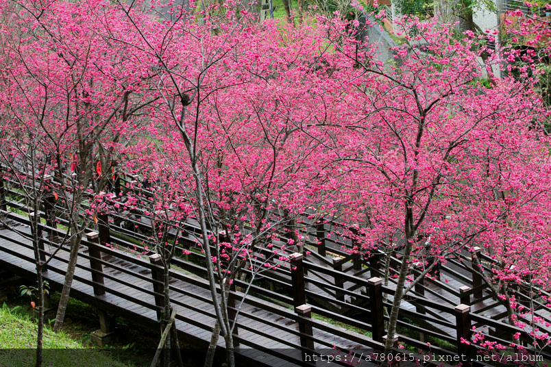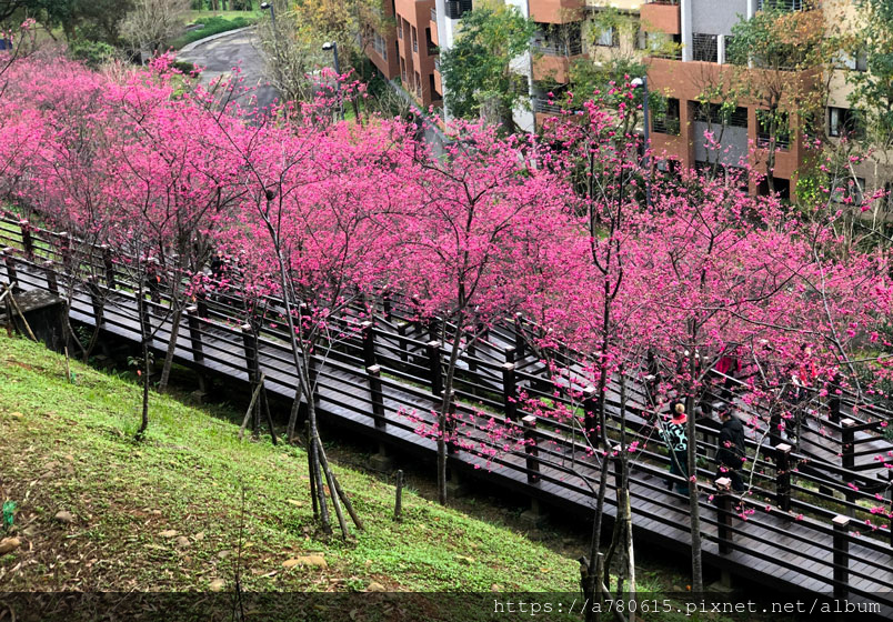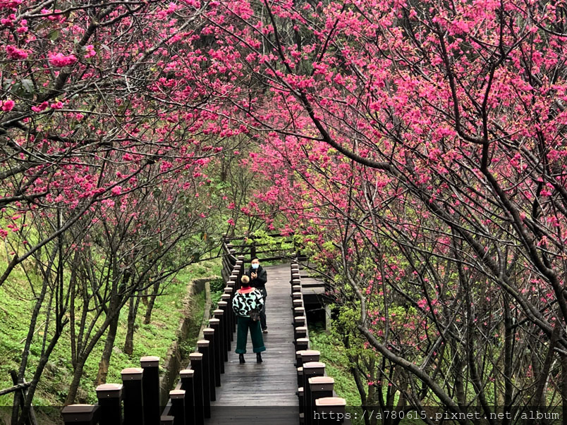 櫻花搭配木棧道的景觀,相當美麗。雖然天候不佳,仍就按了