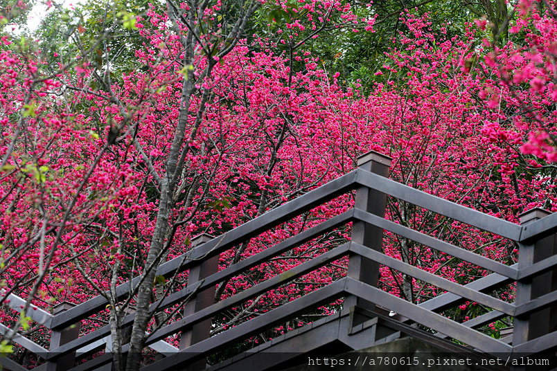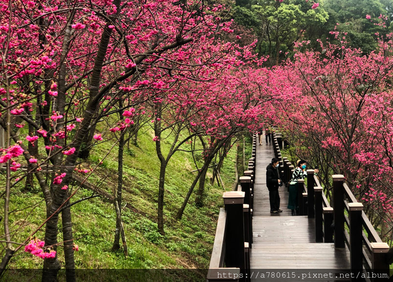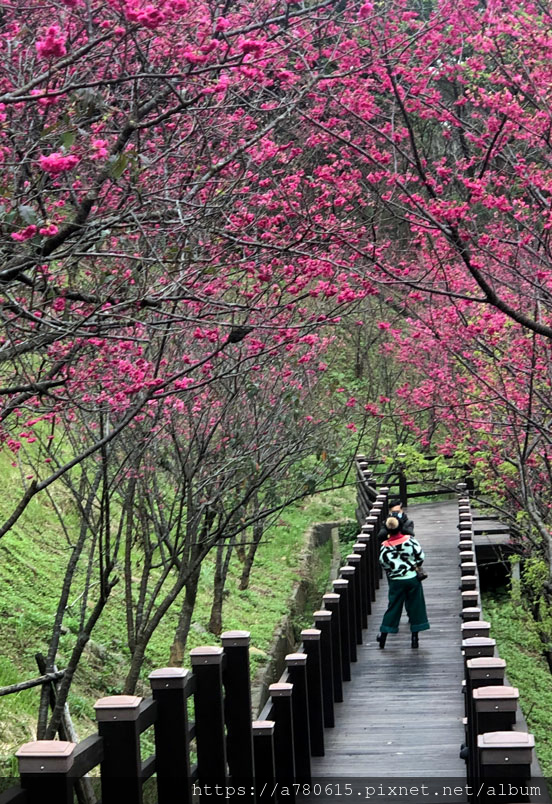 ,沿著Z字型木棧道,從不同角度看著桃紅艷麗的八重櫻,也是