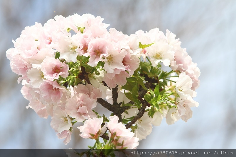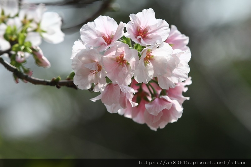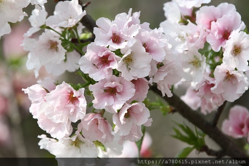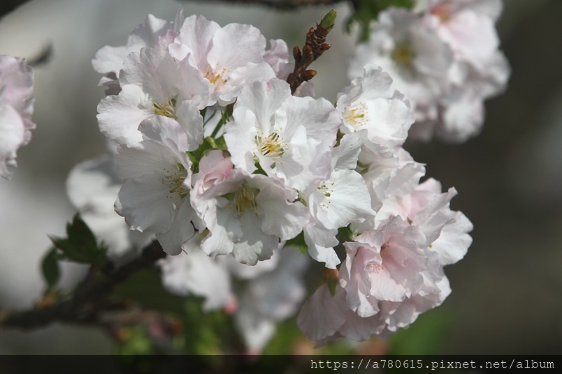 墨染櫻枝條色深如淡墨,圓潤的花形,初開花時,純白淡