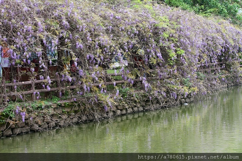 公園湖畔的棚架上,綴滿珠串般的紫,如同一面浪漫的