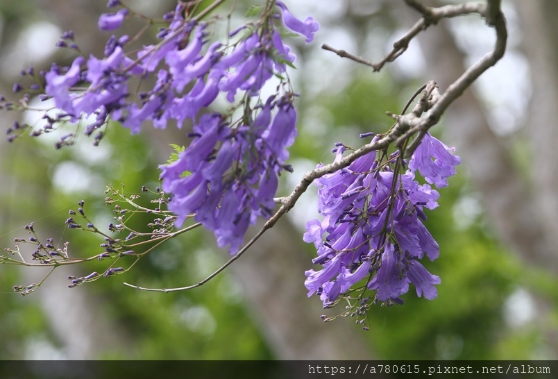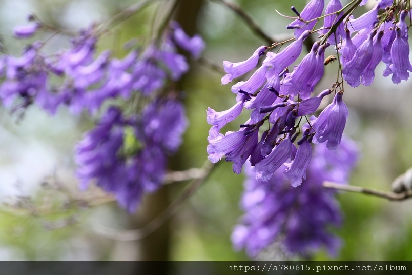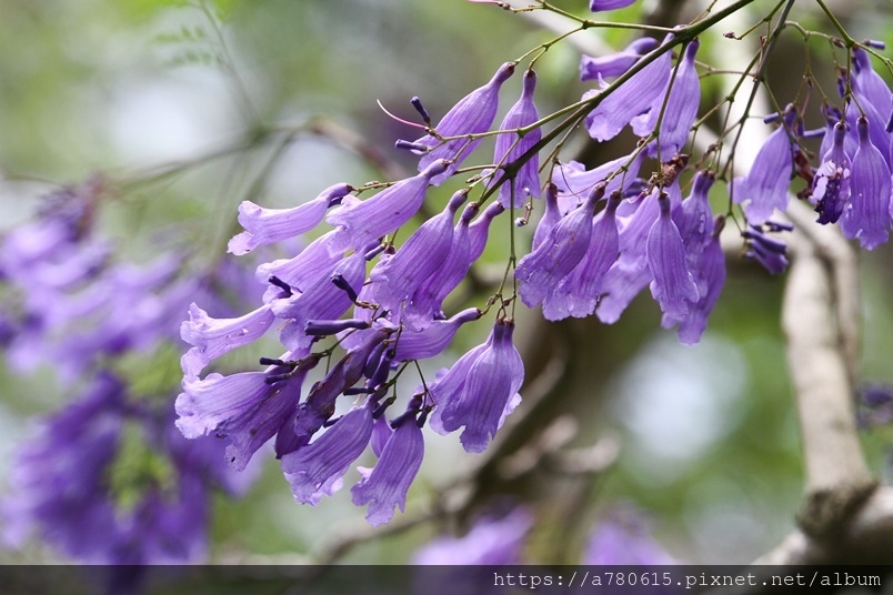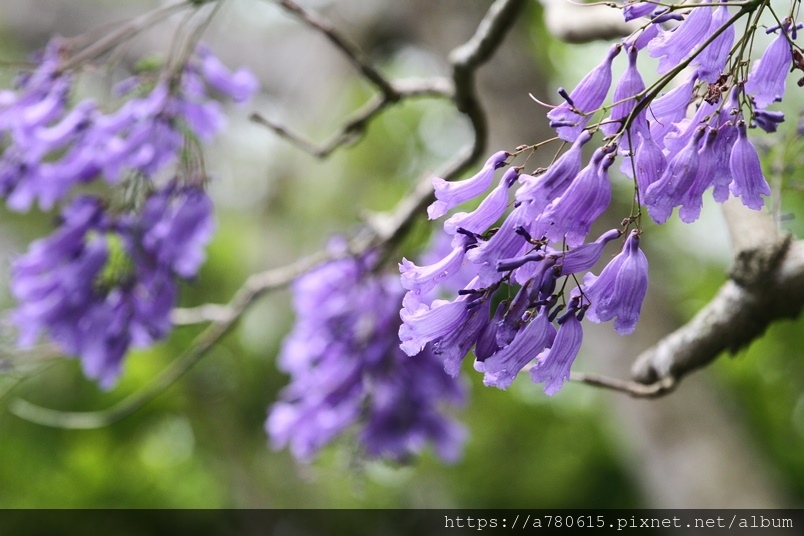 春天開花,著生於枝條,花冠筒狀扁管狀小花,下端膨脹成鐘型,為藍紫色,盛開時全株花序密集,串串紫藍非常美觀,花期約1個月,邊開邊落,為大地鋪上了一整片的紫色地毯,宛如絕美的畫作般吸引著賞花者的目光。