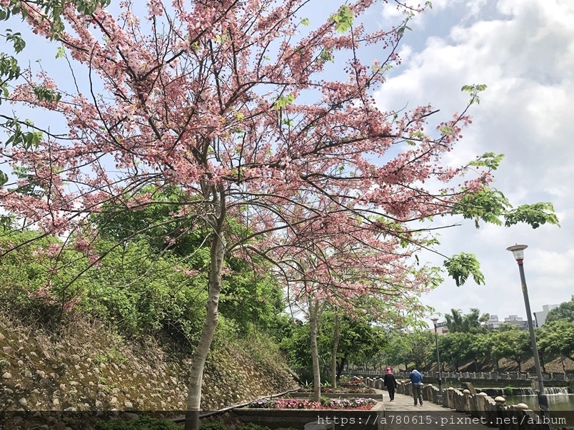 親水公園,種了幾株花旗木,現在正值盛開期,滿樹芳