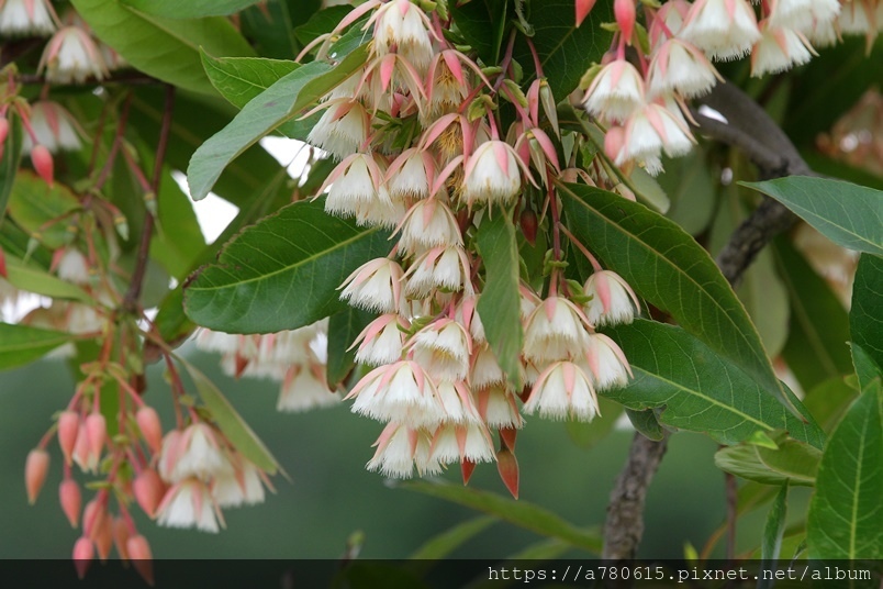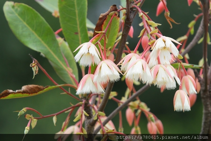 花朵通常3至6朵簇生,懸垂在枝條,粉紅色花萼包