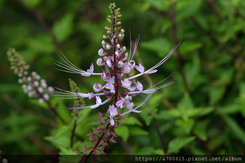 貓鬚草為唇形科多年生直立草本。基部木質化,葉片菱形,鋸齒緣,兩面被短毛。