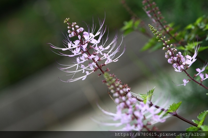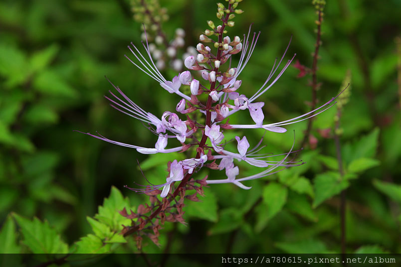 貓鬚草,別名:腎茶、貓鬚公、圓錐直管草、化石草。原產於東南亞、澳洲、印度等地。其花絲細長,伸出花冠狀似貓的鬍鬚,因而得名。
