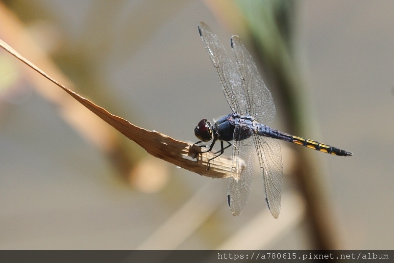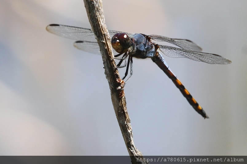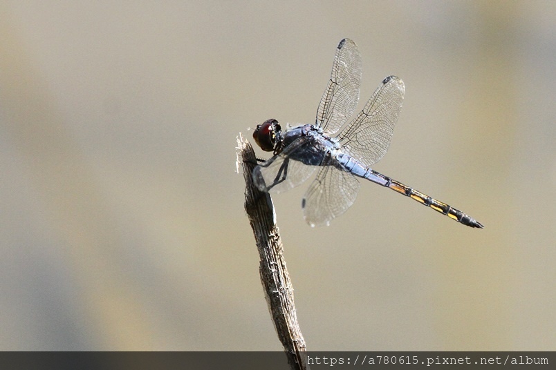 色,合胸藍灰色,側視無斑紋,翅膀透明,翅痣黑色