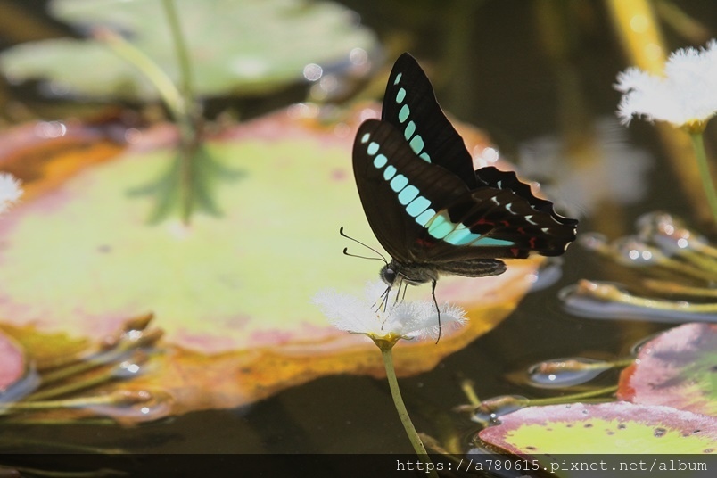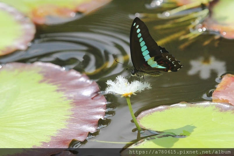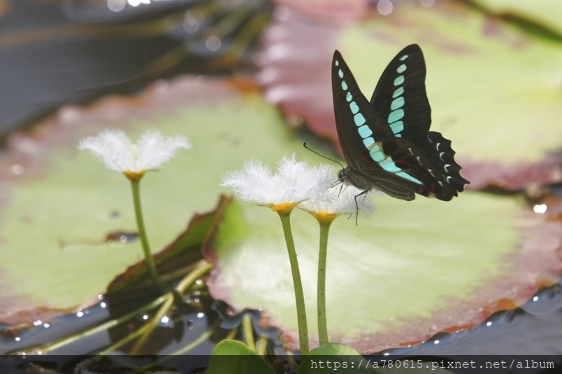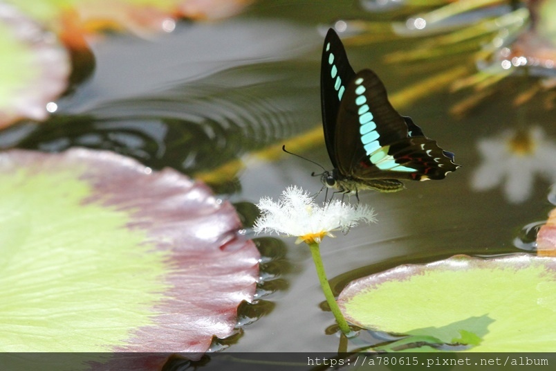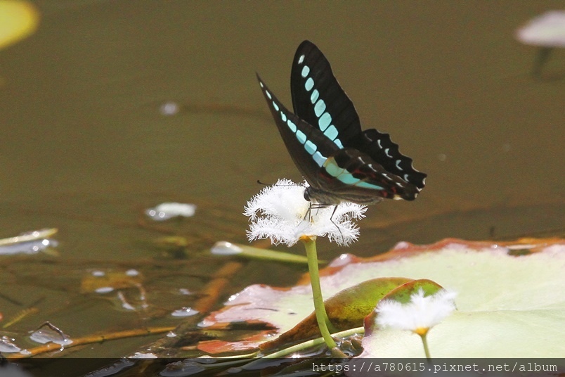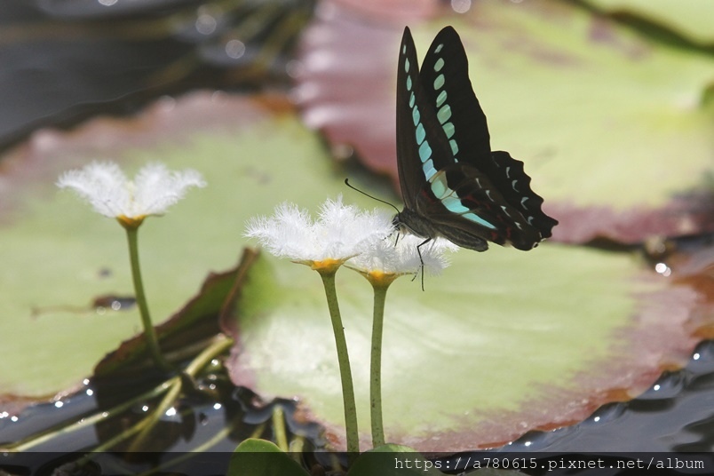 首次在印度莕菜上看見青帶鳳蝶吸蜜,黑白兩色差