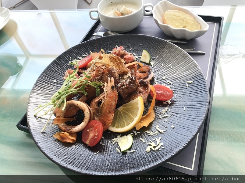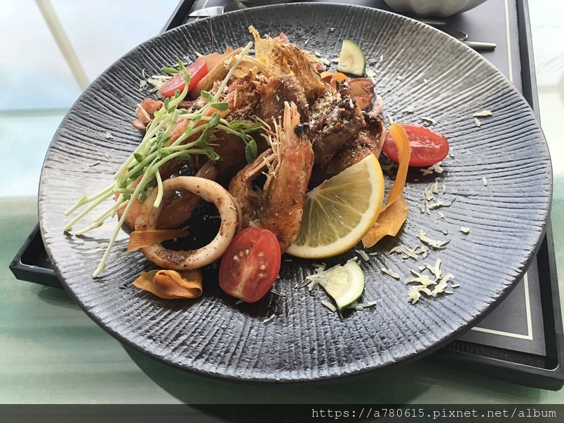 我們點了魚油醋沙拉、綜合海陸雙拼和一壺洋