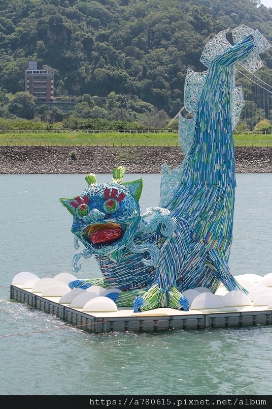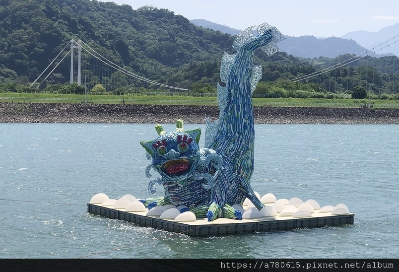 藝術家王振瑋的《大溪神獸》佇立於中庄池面上。