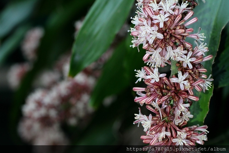 花正面白色,背面具暗紅色條紋。頂端長出紫紅色縱