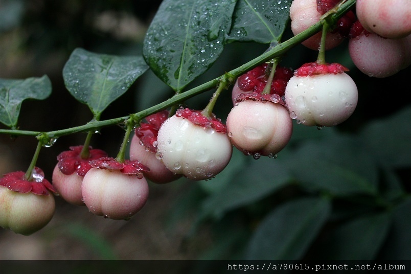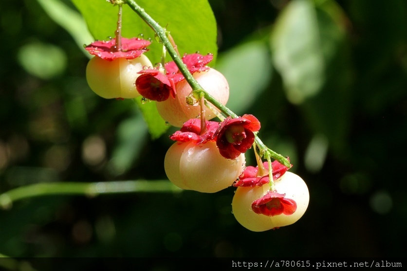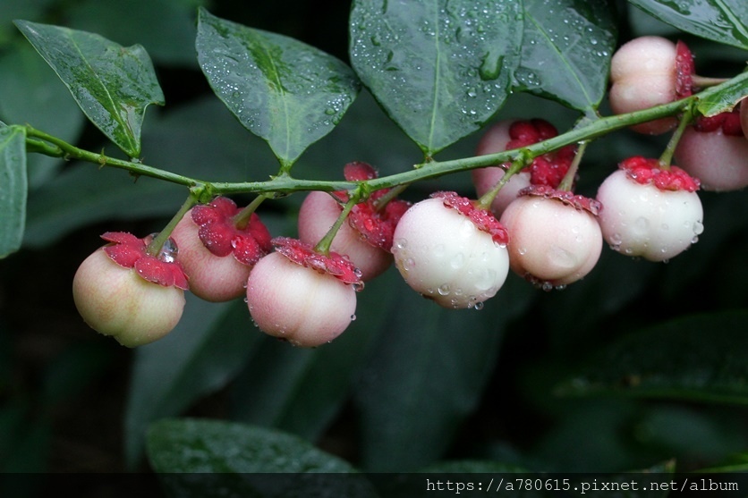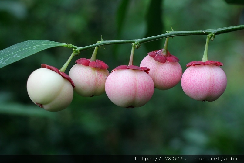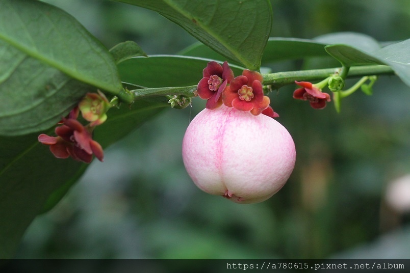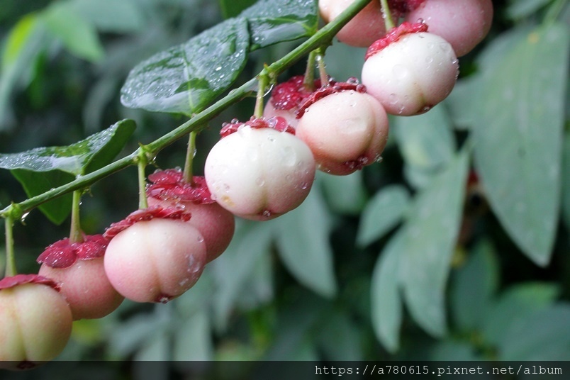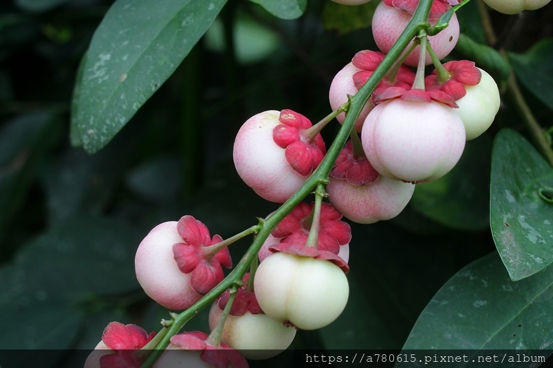 蒴果扁球狀或圓球狀,乳白色帶粉紅色暈,宿存6瓣紅