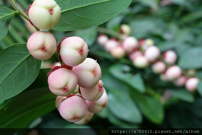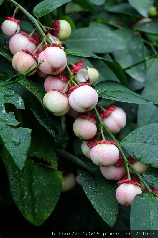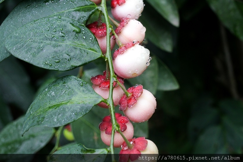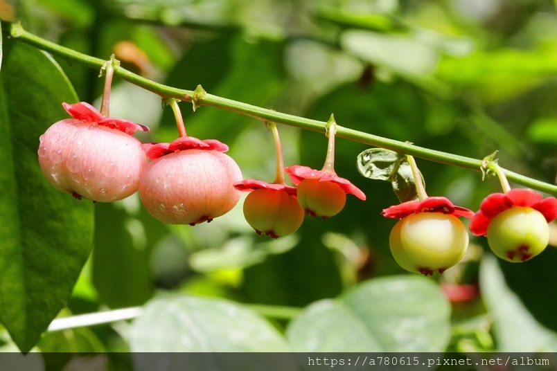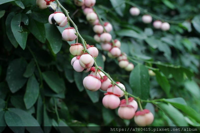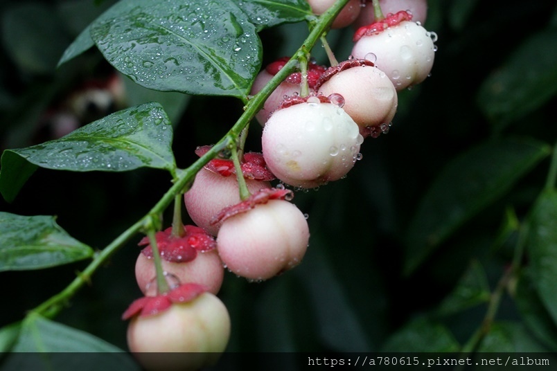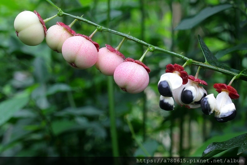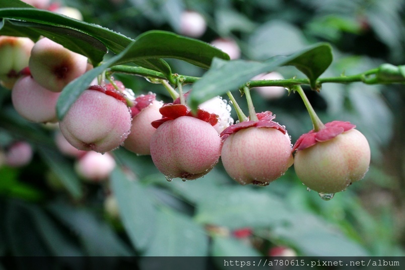 蒴果扁球狀或圓球狀,乳白色帶粉紅色暈,宿存6瓣紅