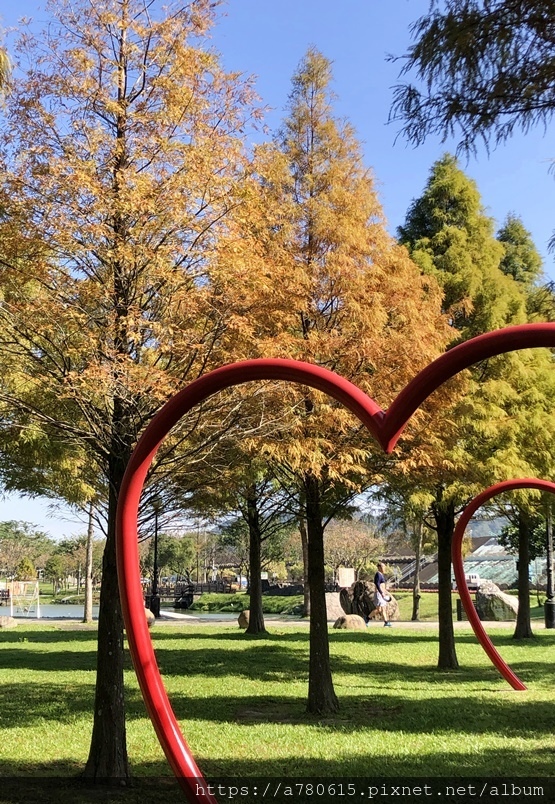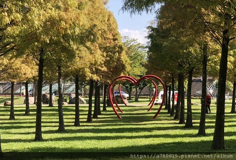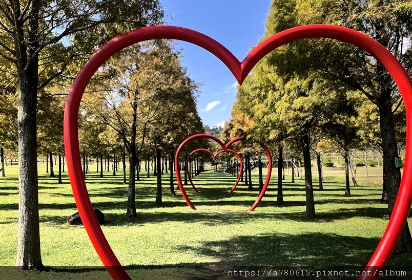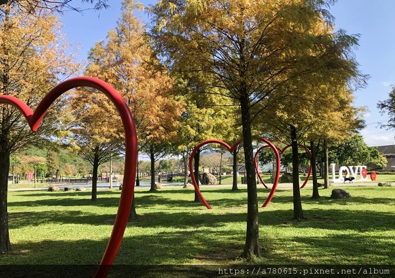 落羽松林之中安置了三個愛心裝置,不論是賞景或是