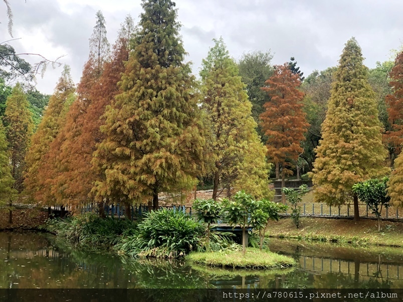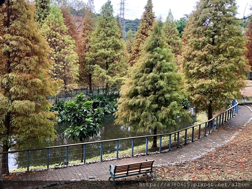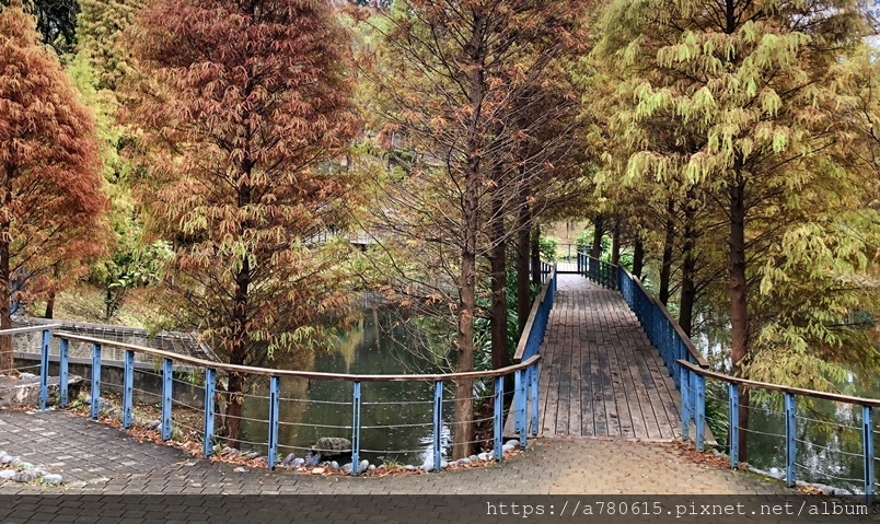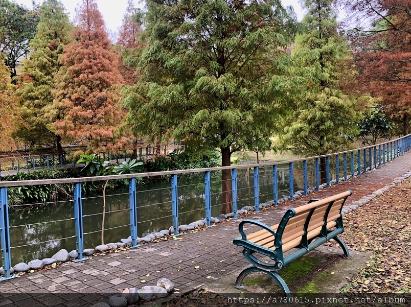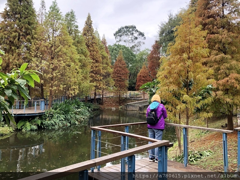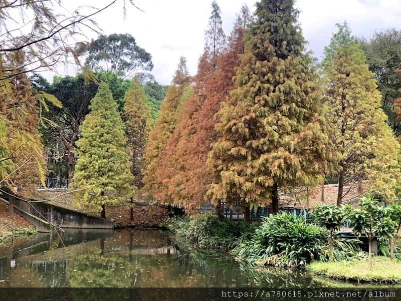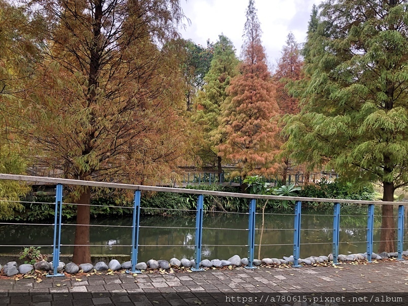 個滯洪池,池畔種植數十棵落羽松,也悄悄換上新裝