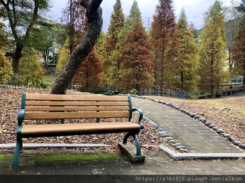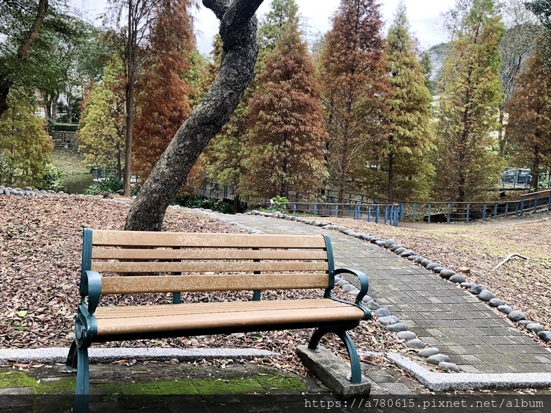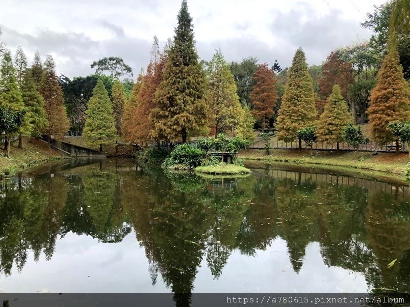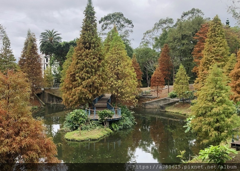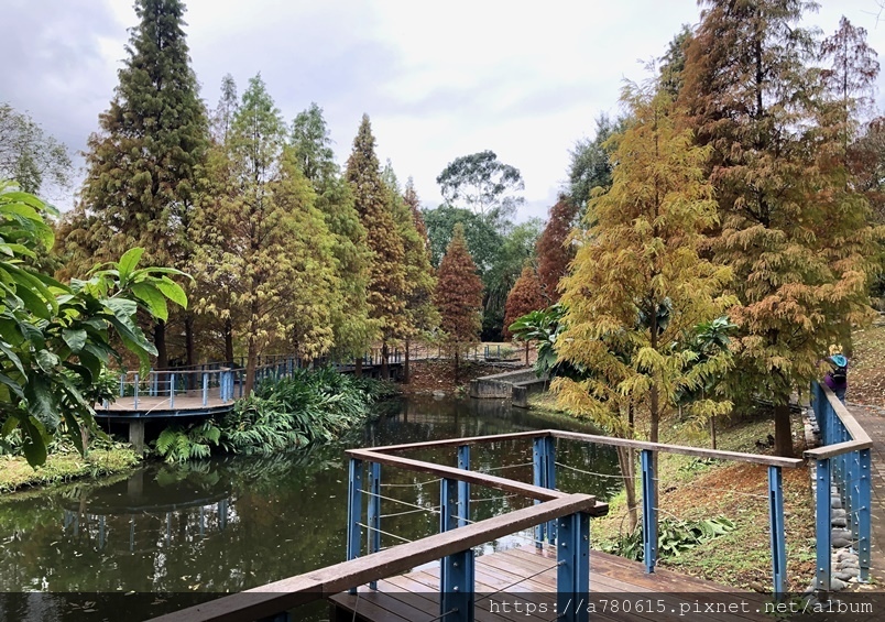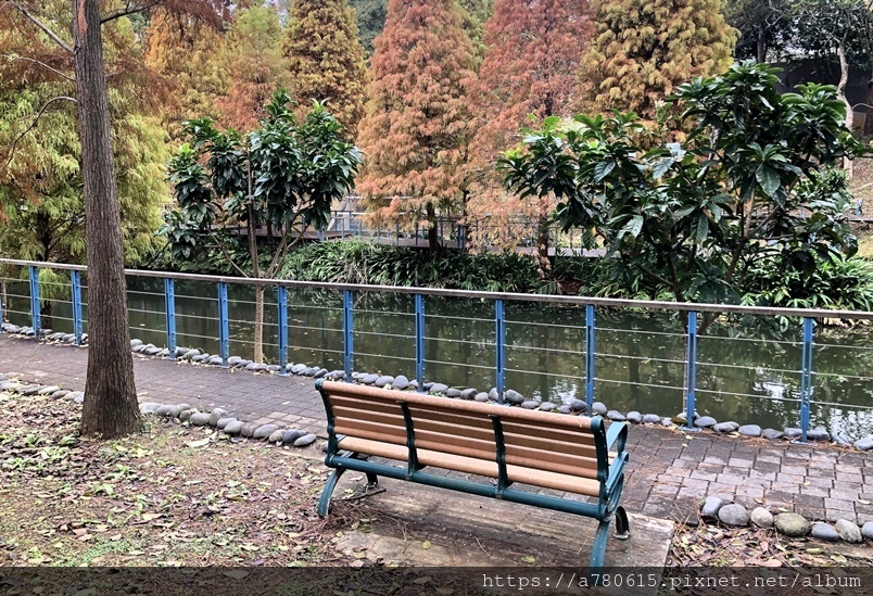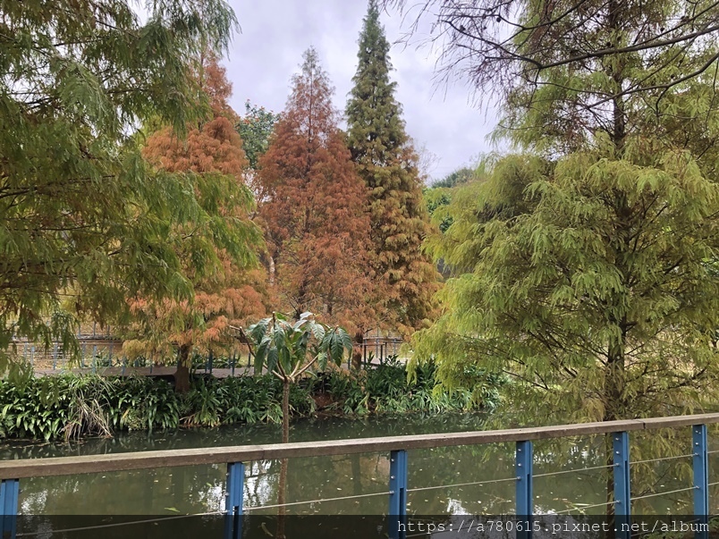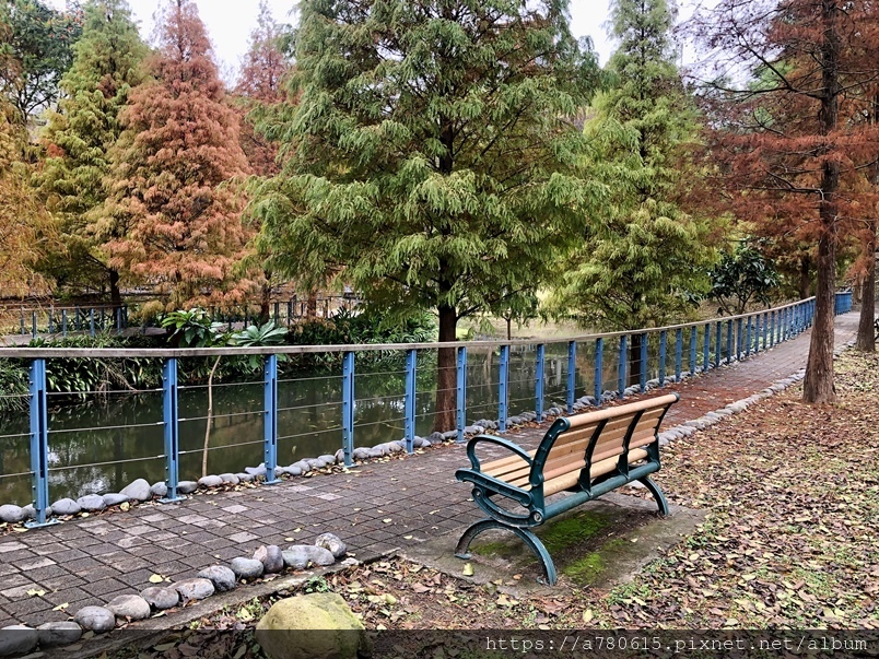 個滯洪池,池畔種植數十棵落羽松,也悄悄換上新裝
