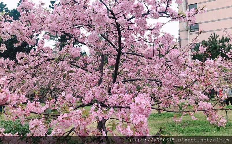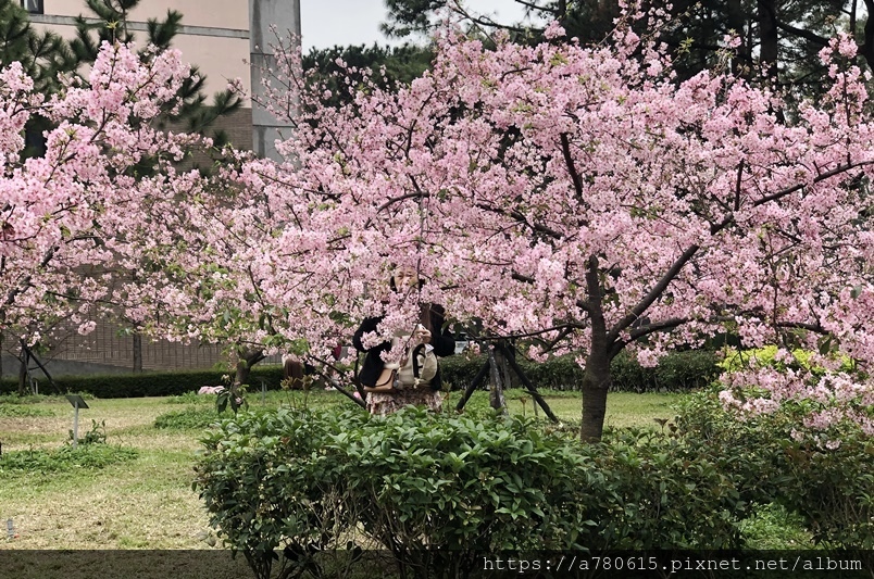 大學的河津櫻正滿開怒放,這裡交通方便、校園又