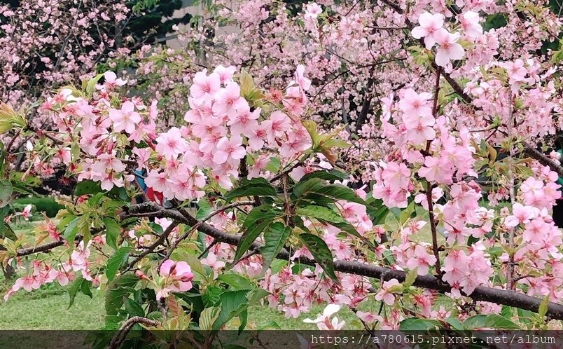 翠綠的草坪上,盛開的河津櫻,整片嫣紅十分浪漫