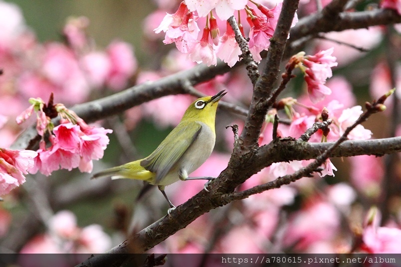 一群嬌小的綠繡眼,正在櫻花枝椏之間,專心而忙碌地覓