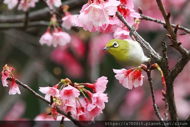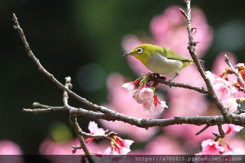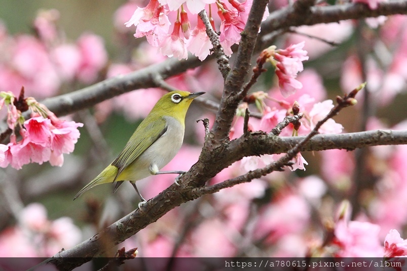 小巧玲瓏的綠繡眼與盛開的櫻花,共同交織為美麗的花鳥