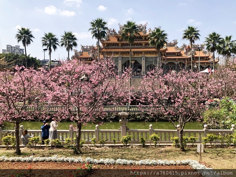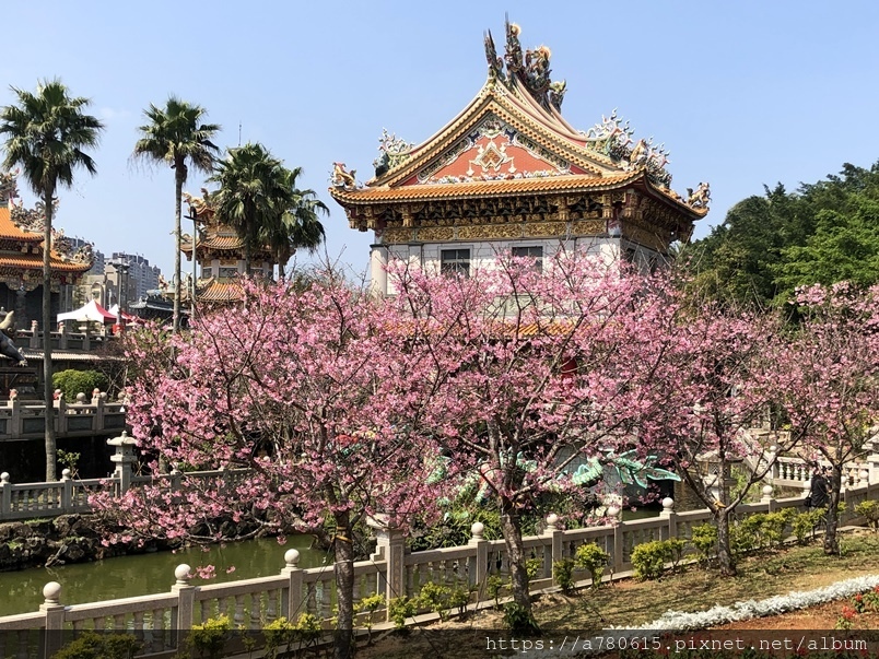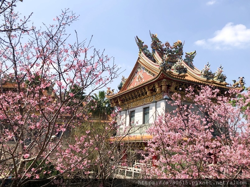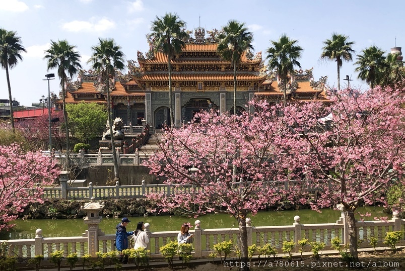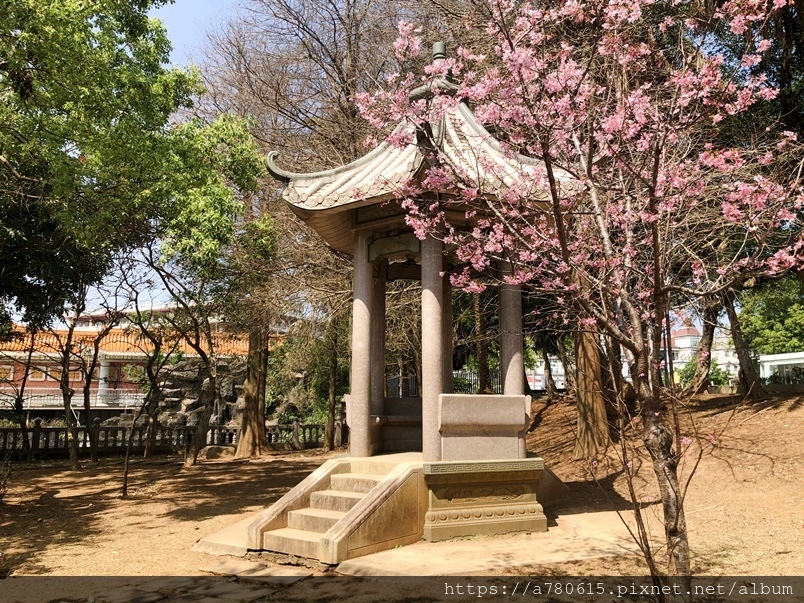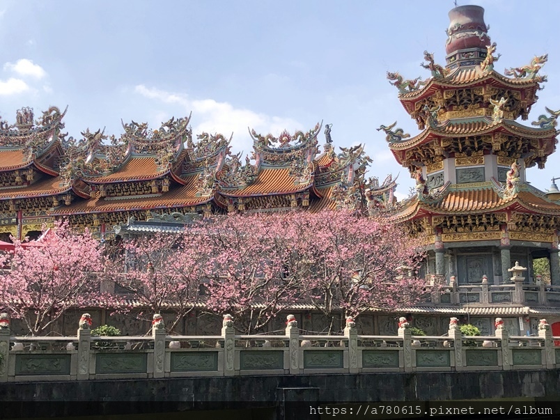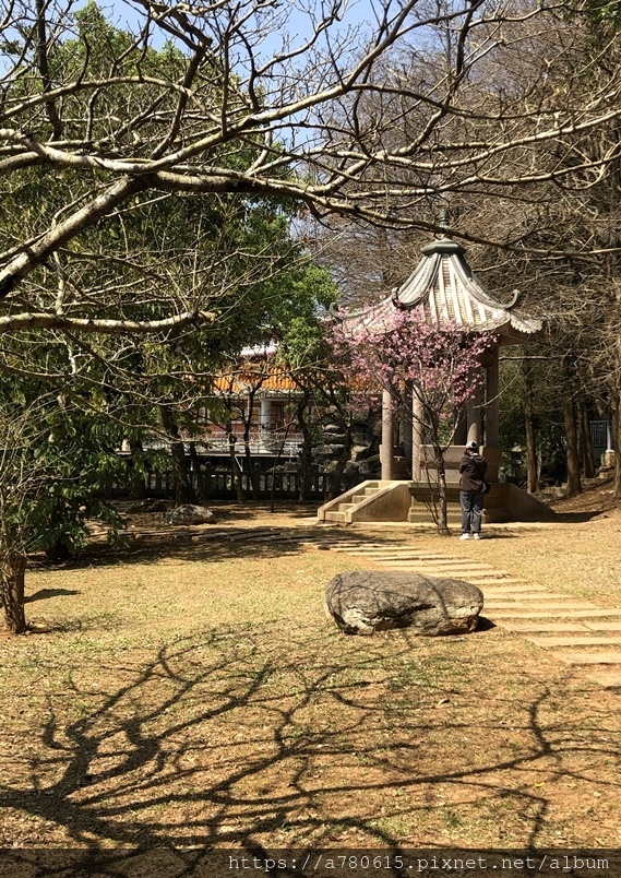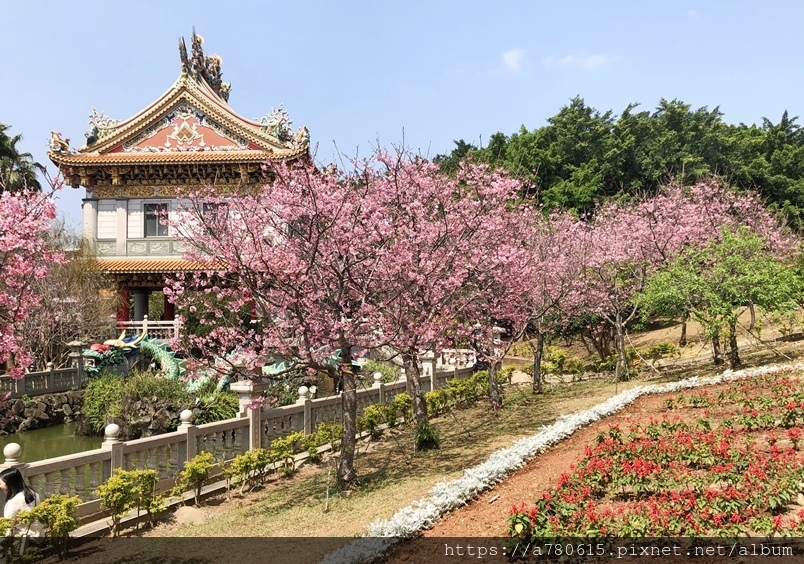 的廟宇與奼紫嫣紅的櫻花交互輝映,襯著庭園小橋流水