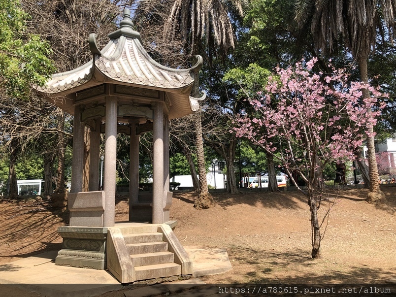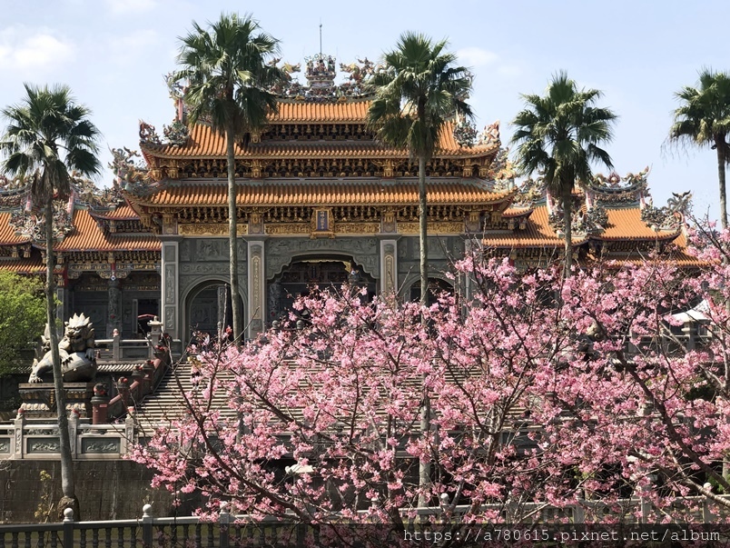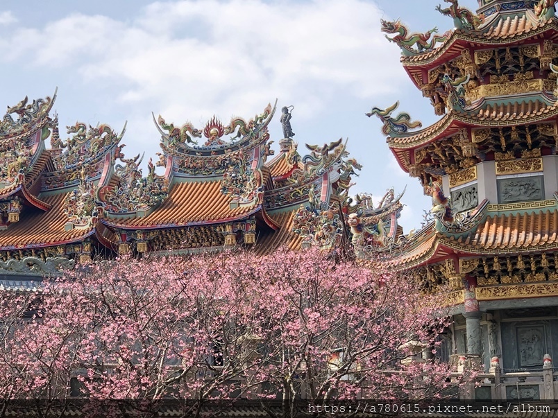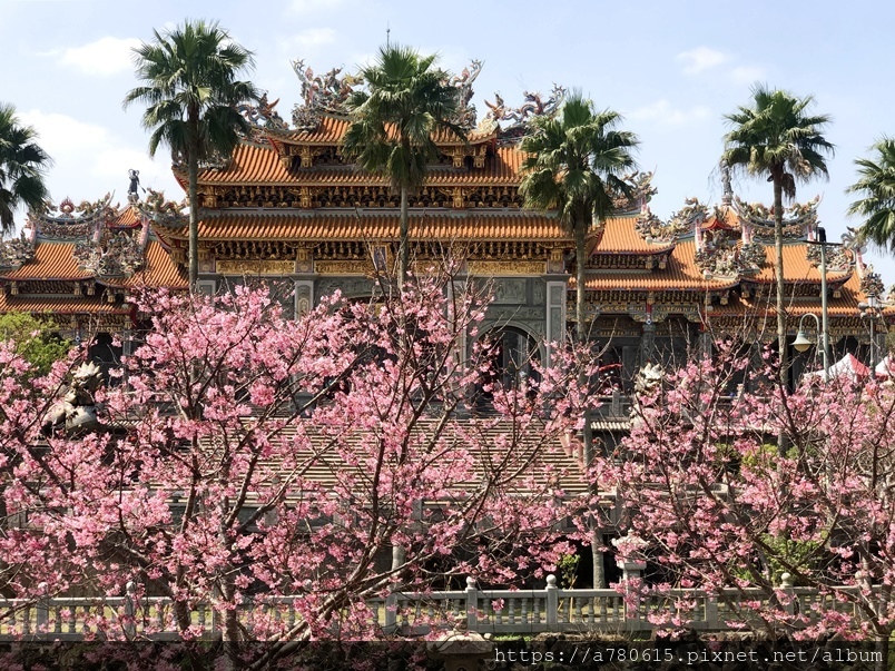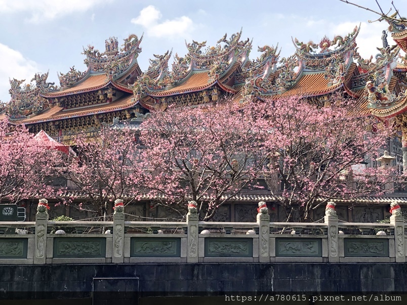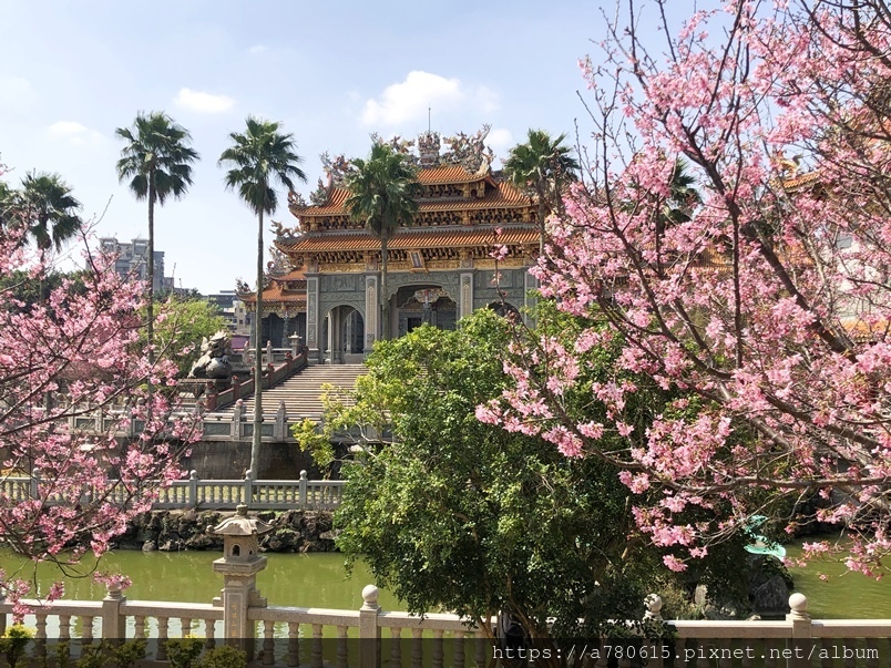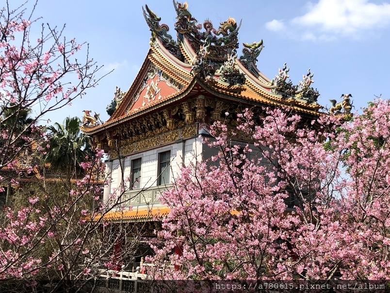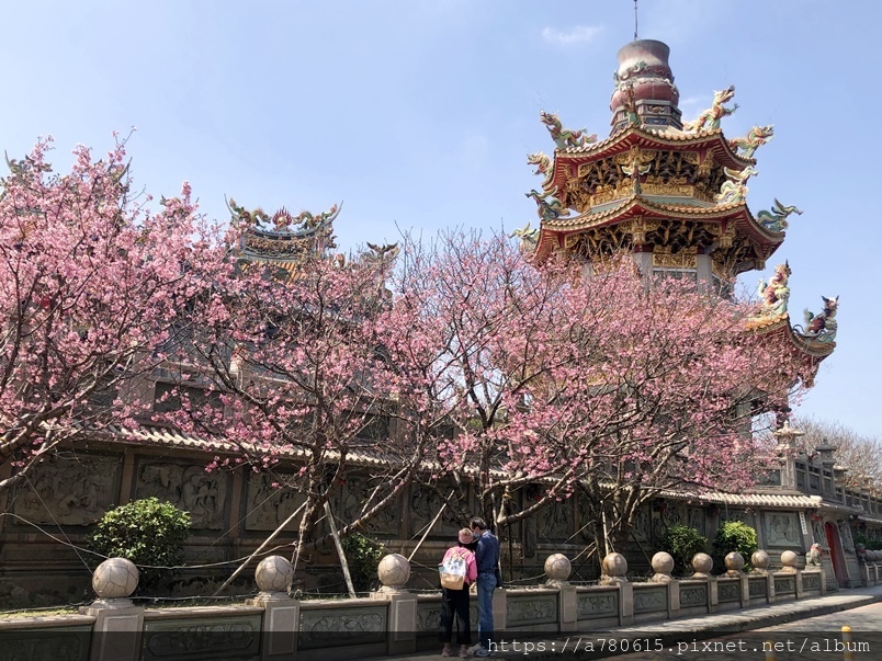 的廟宇與奼紫嫣紅的櫻花交互輝映,襯著庭園小橋流水
