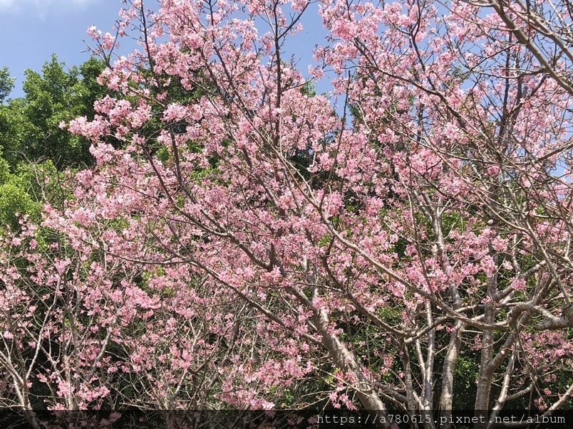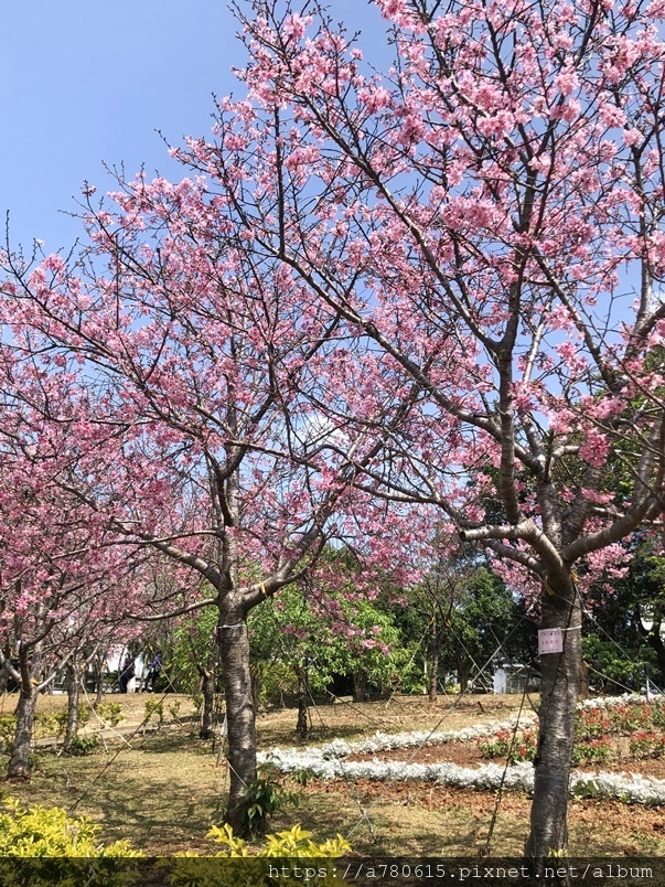 的休憩公園內,粉粉嫩嫩的櫻花在藍天下特別漂亮,