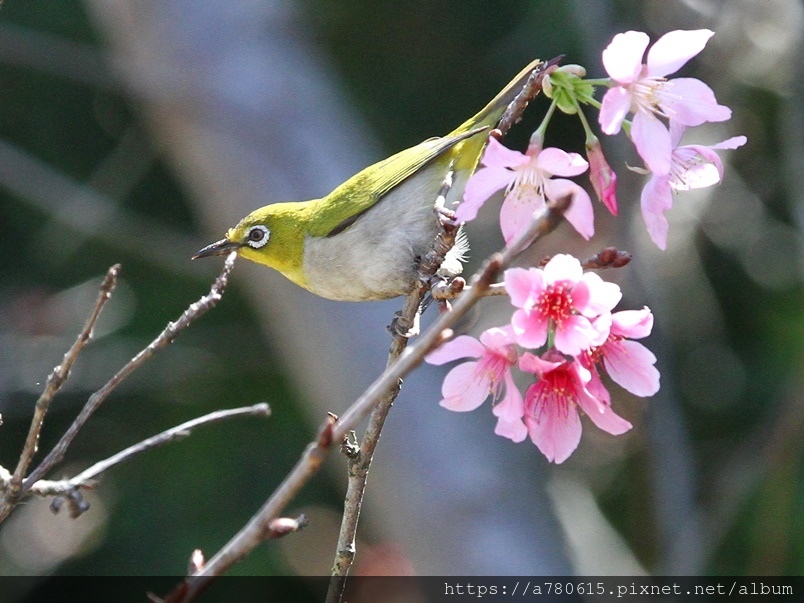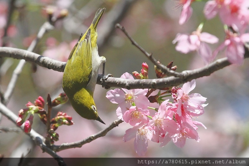 綠繡眼吱吱喳喳忙著吸蜜,春天就是充滿著生命力。