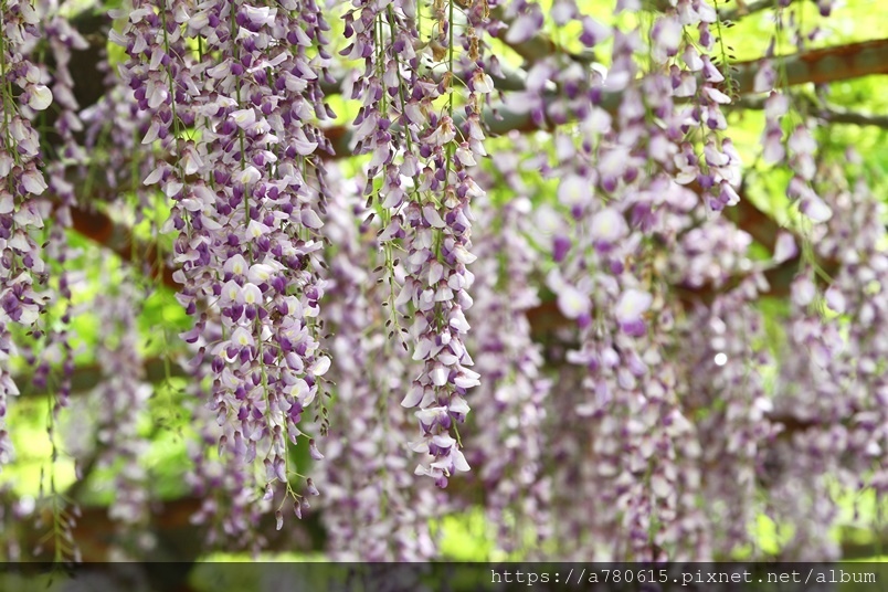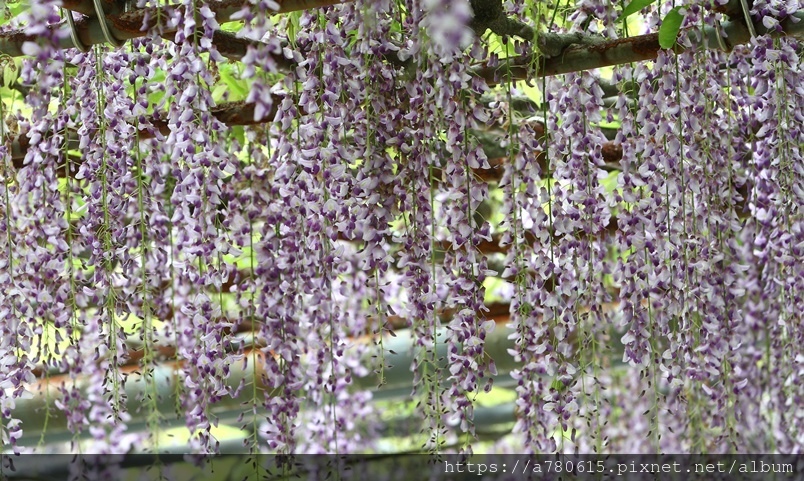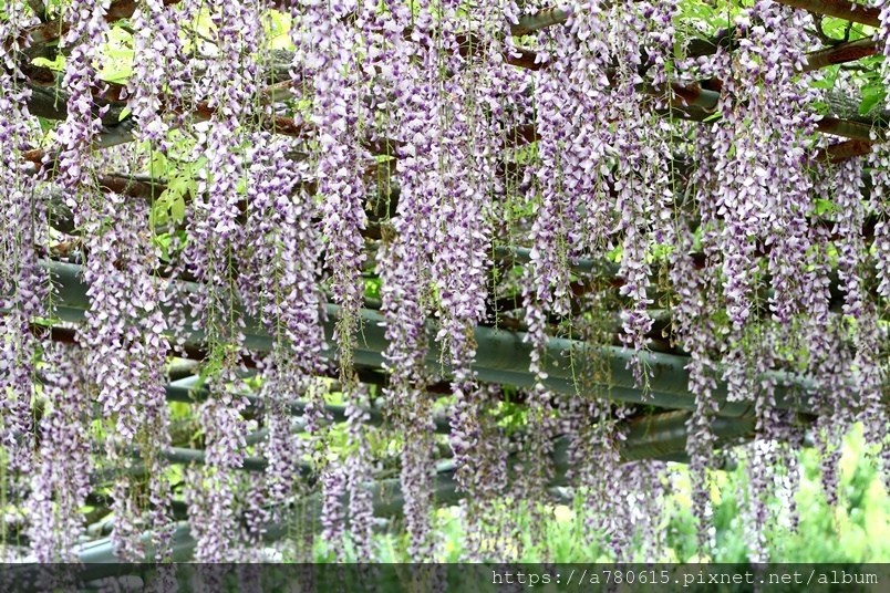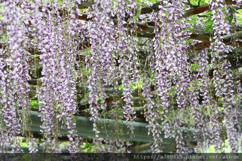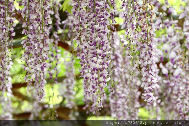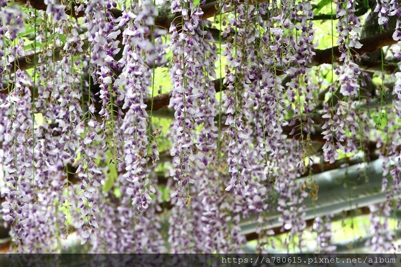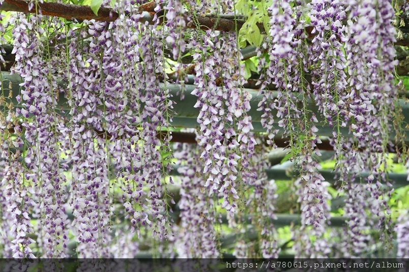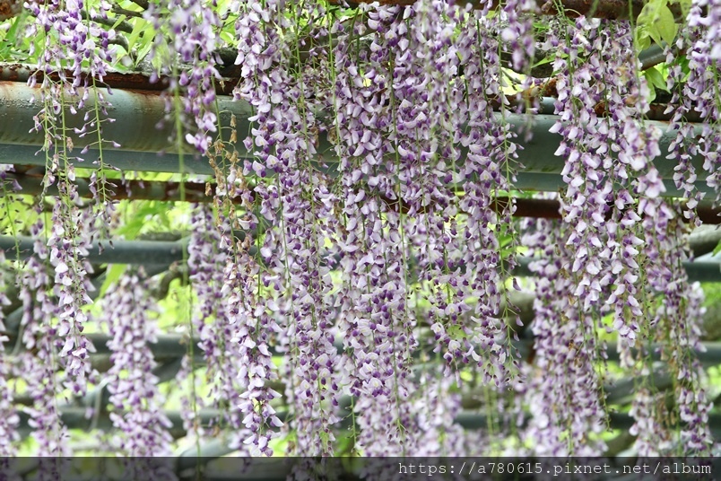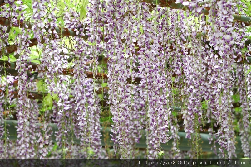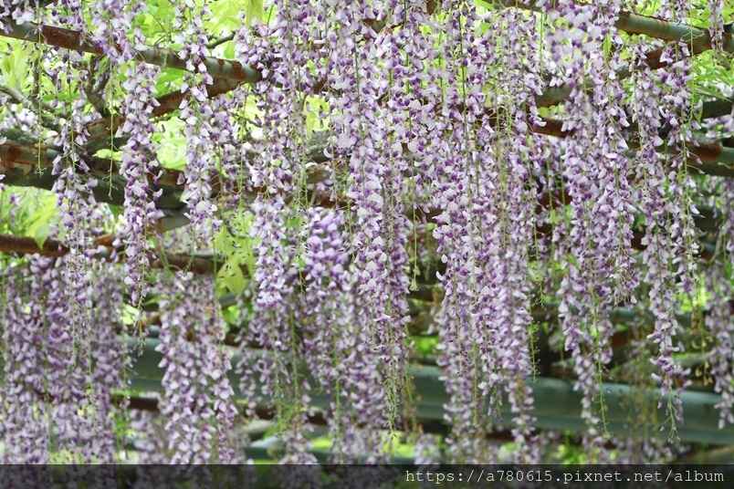 日本紫藤花穗自棚架垂懸而下,隨風擺動,如美女群
