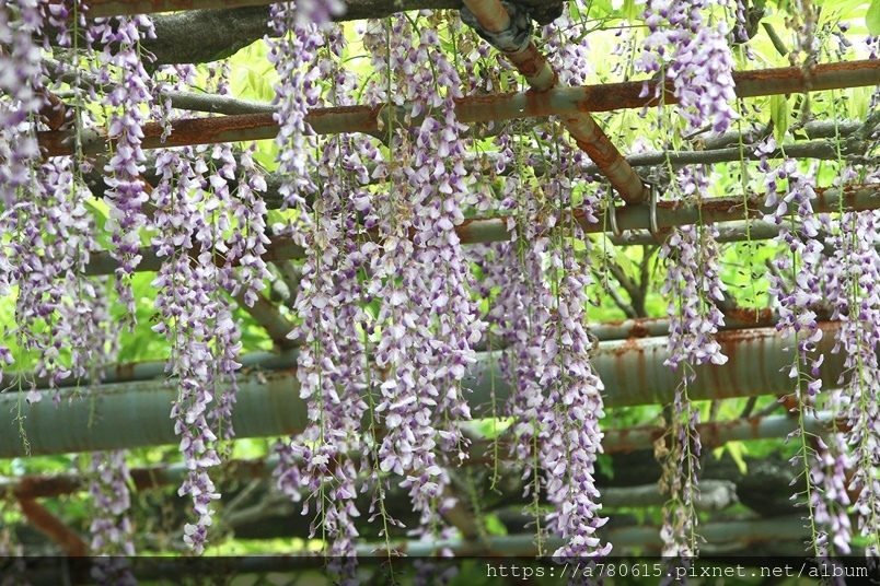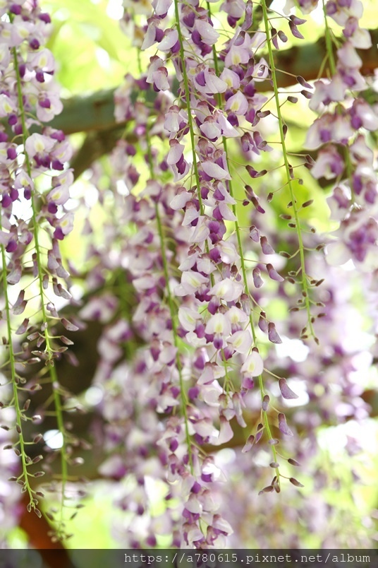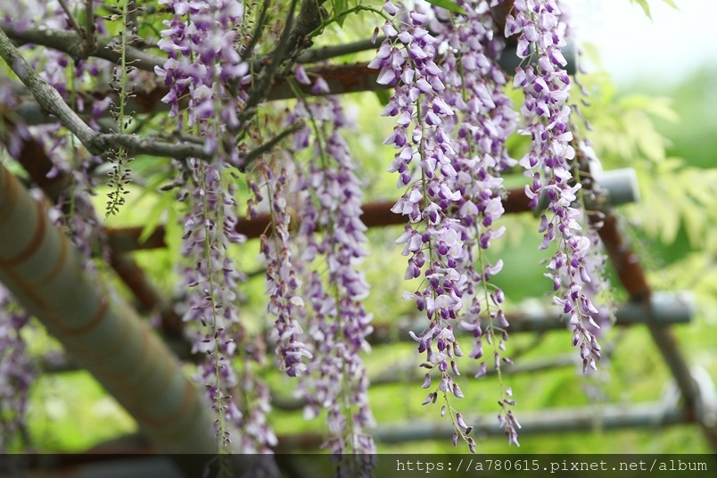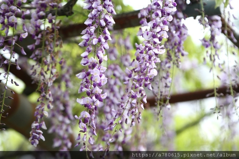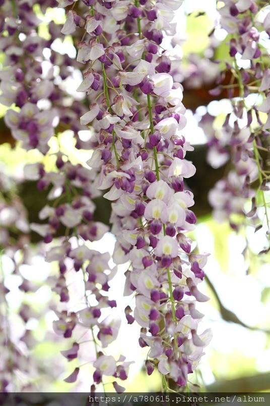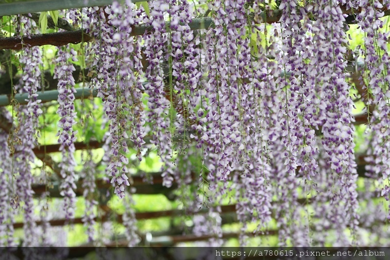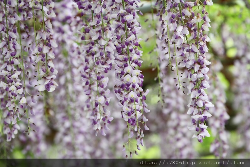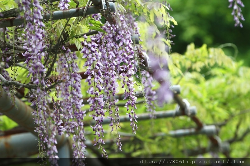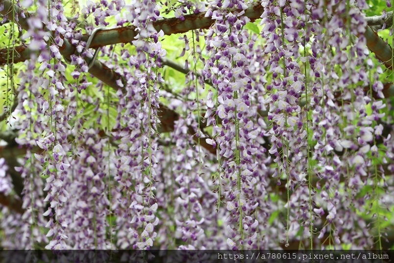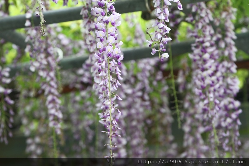 日本紫藤花穗自棚架垂懸而下,隨風擺動,如美女群