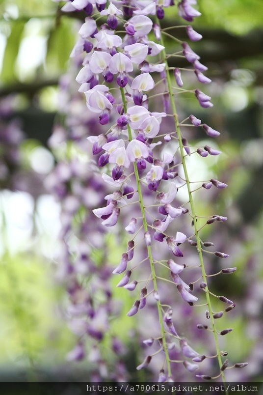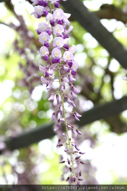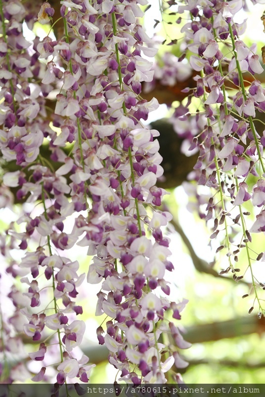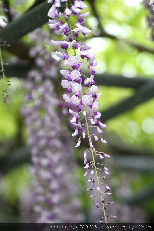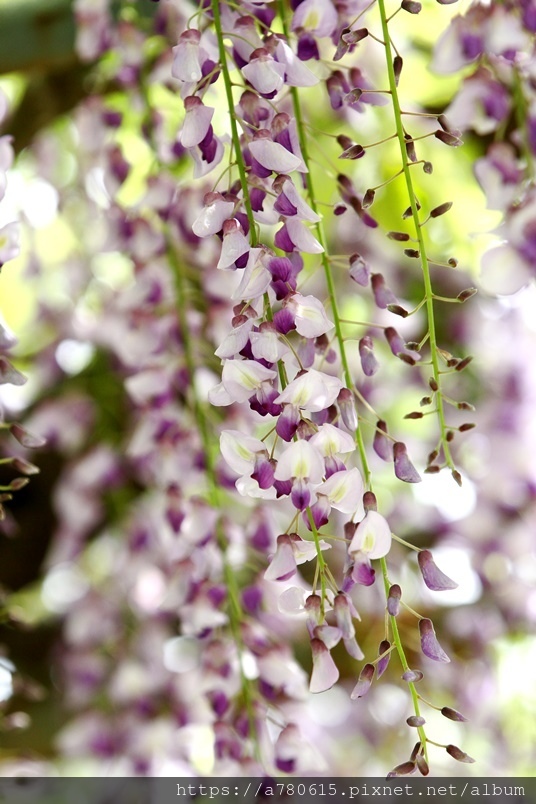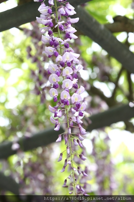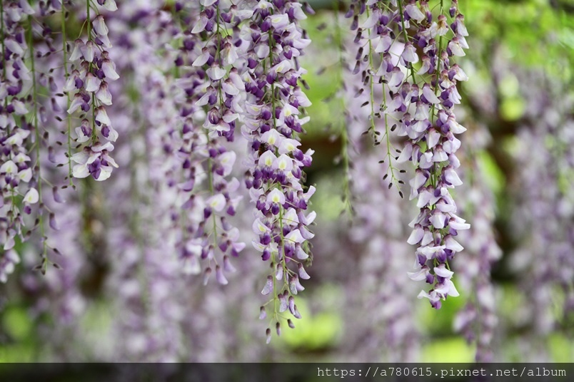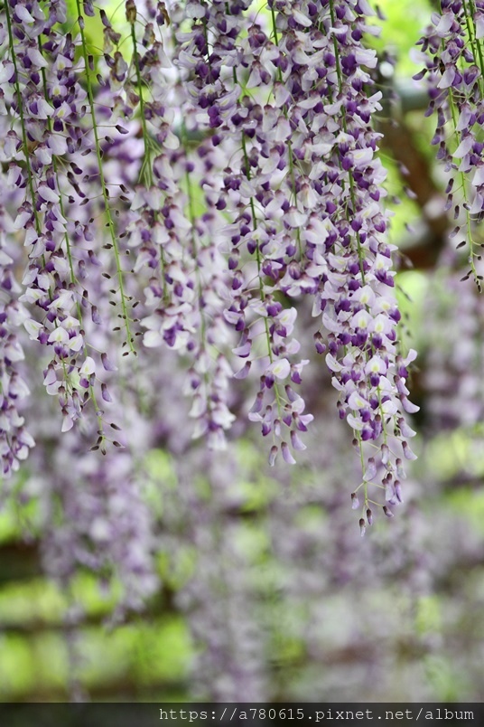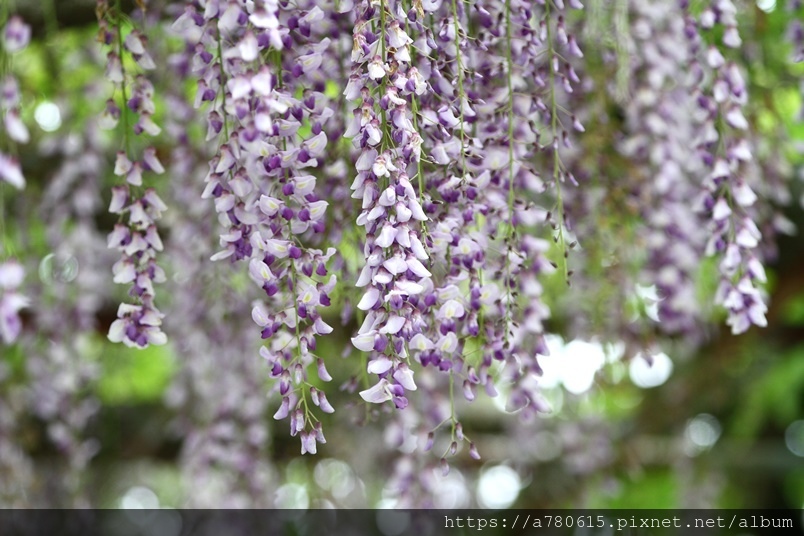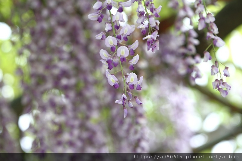 日本紫藤花穗自棚架垂懸而下,隨風擺動,如美女群