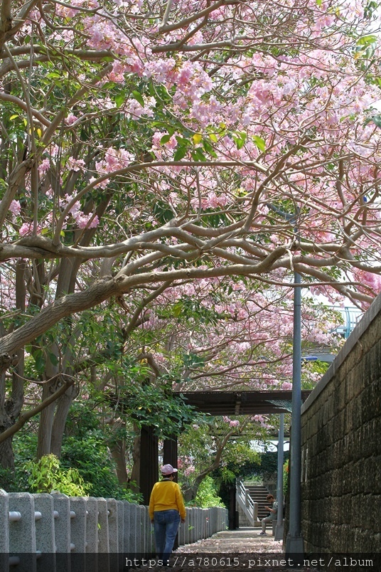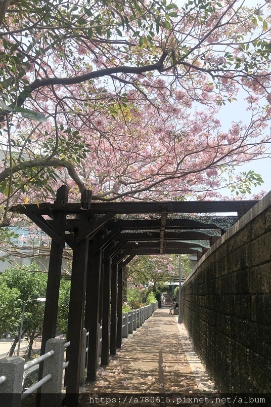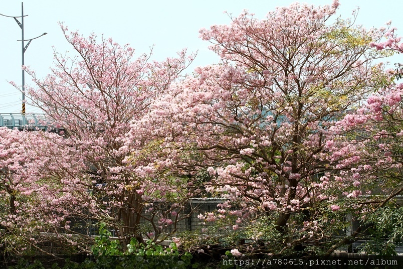 療癒粉紅色風鈴在河堤旁綻放,這裡少有行人,可以拍得
