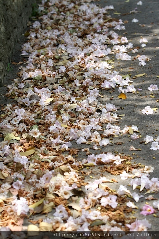 洋紅風鈴木,粉嫩綻放的浪漫畫面,與滿地落花的步道,