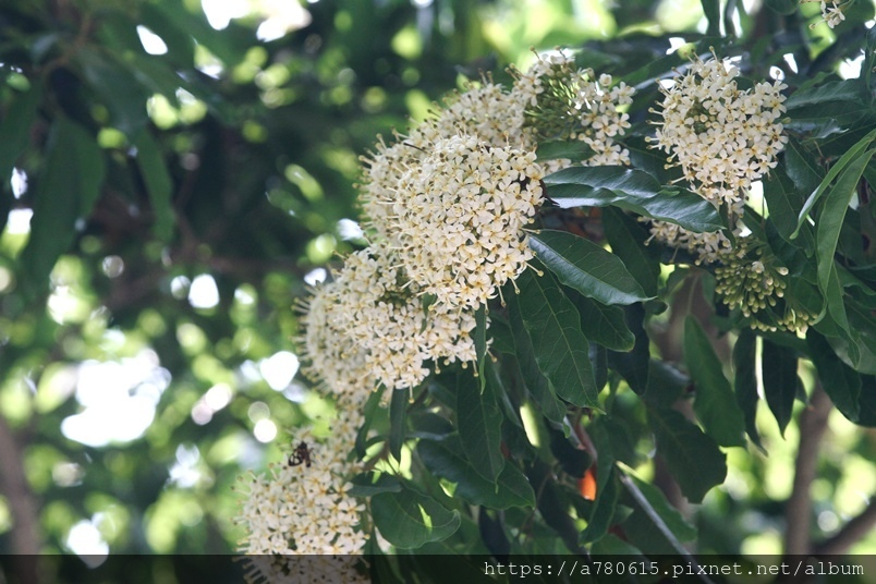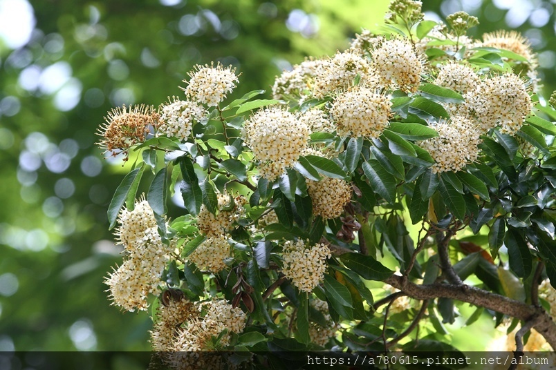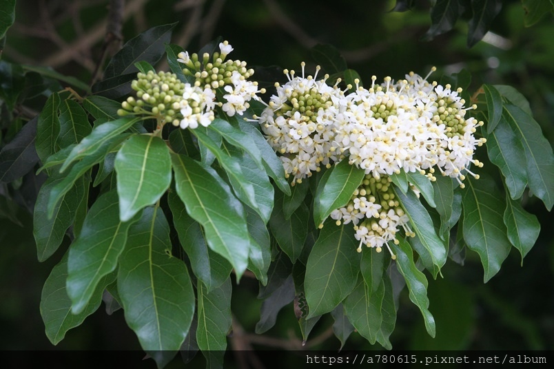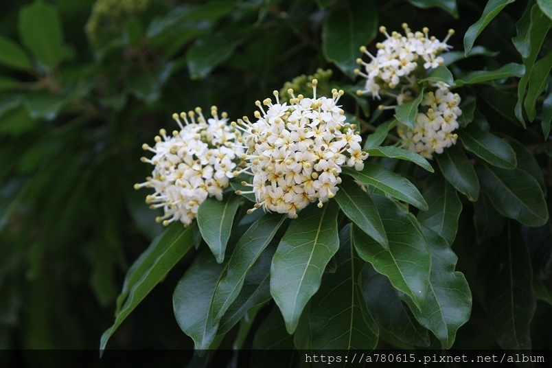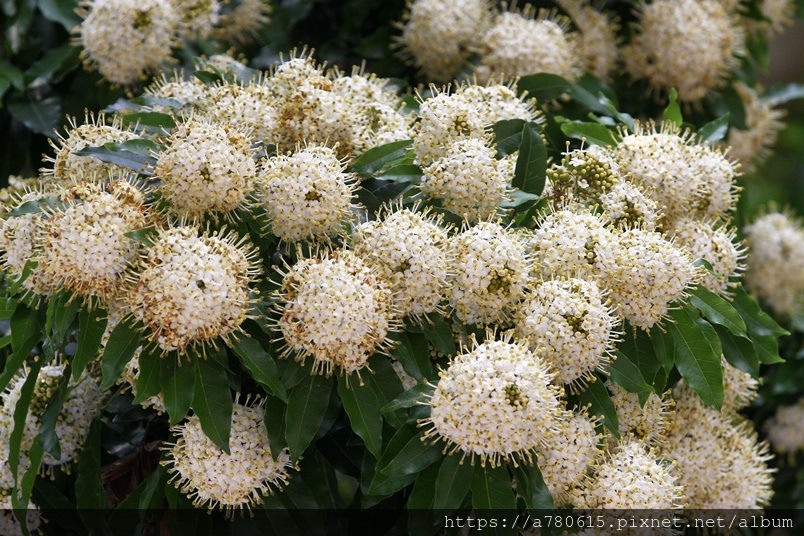白的繖房花序或圓錐花序自枝端開出,形如繡球。白色花