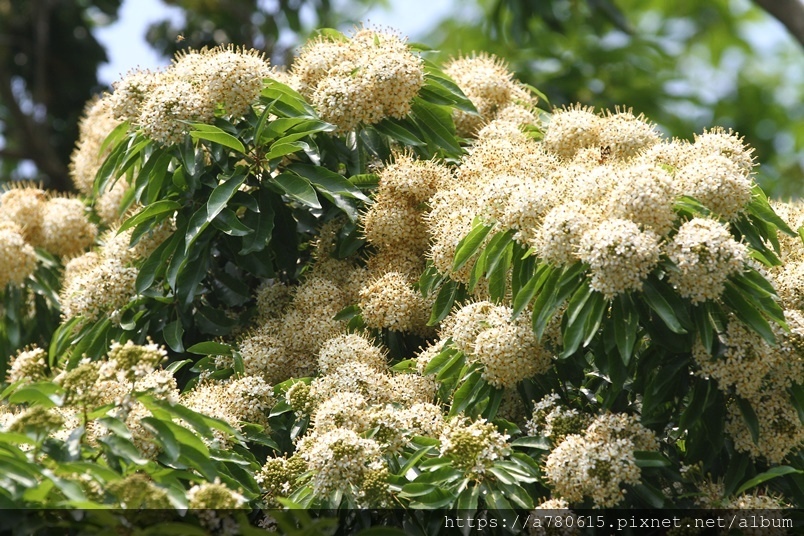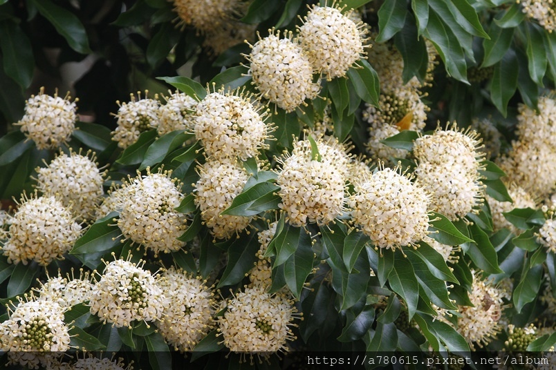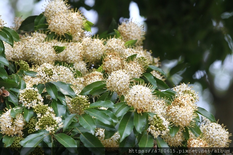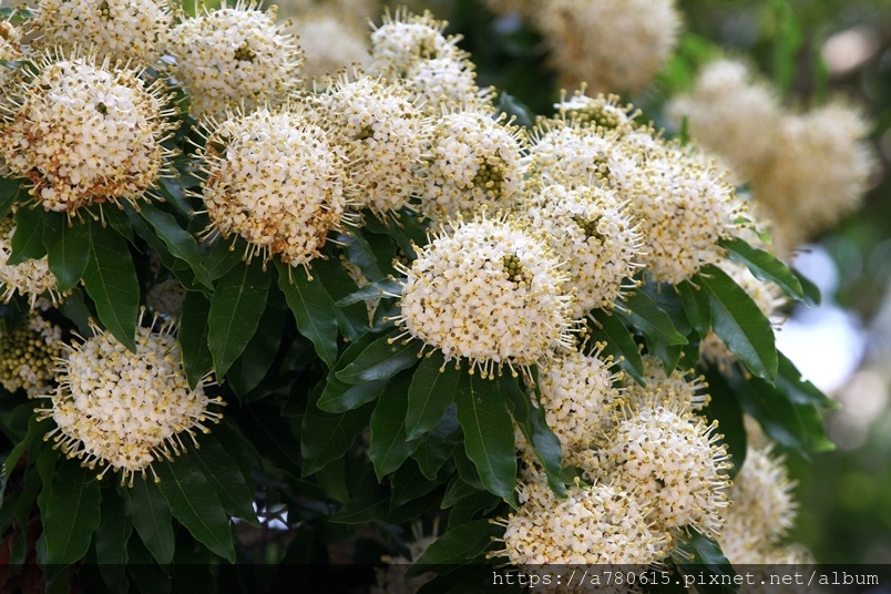 清明節前後,是臺灣梭羅木的花期,樹冠上掛滿一球球純