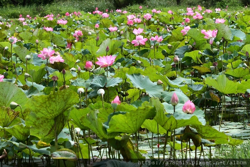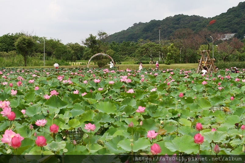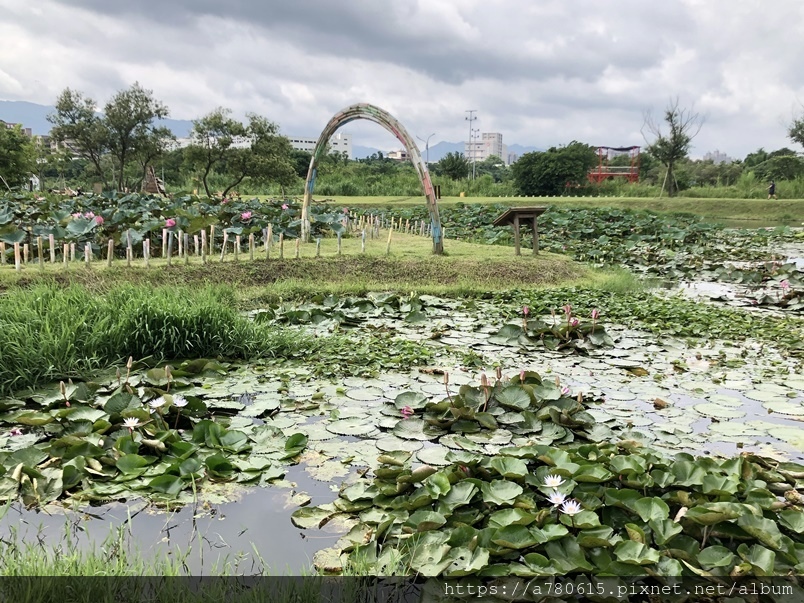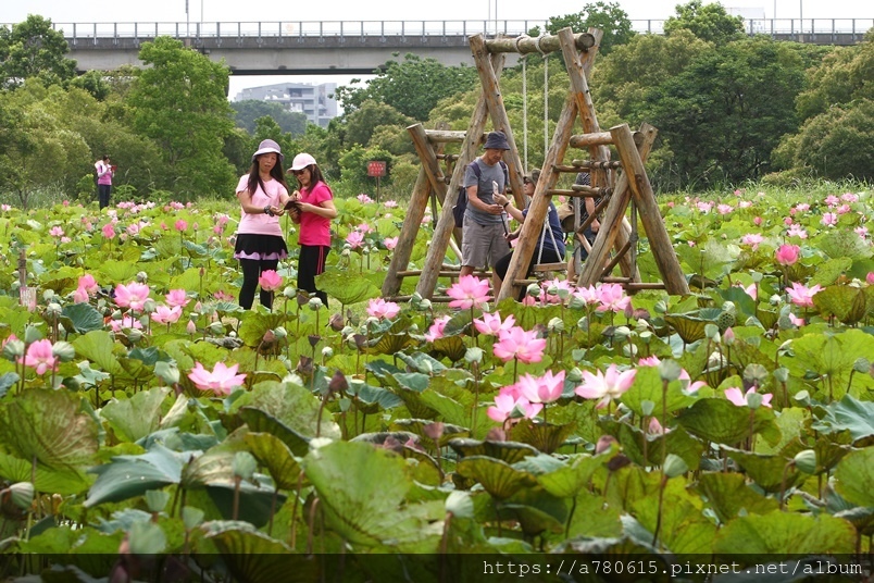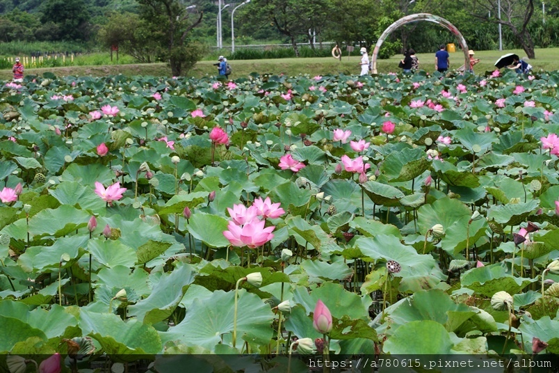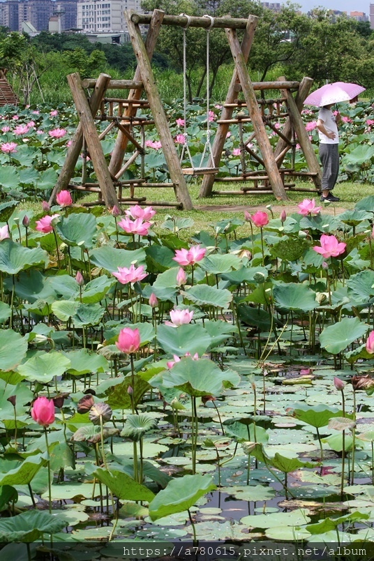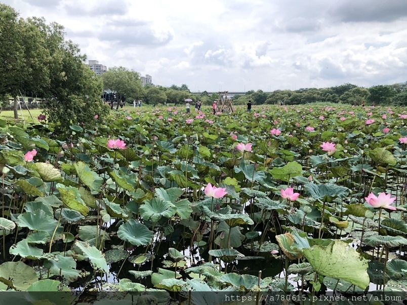 的柑園河濱公園,大片池塘上鋪滿粉色荷花,放眼望去十