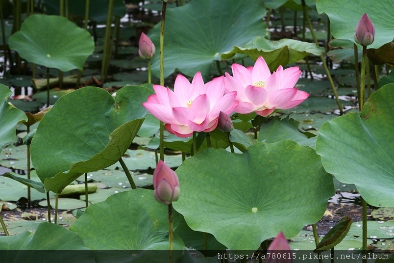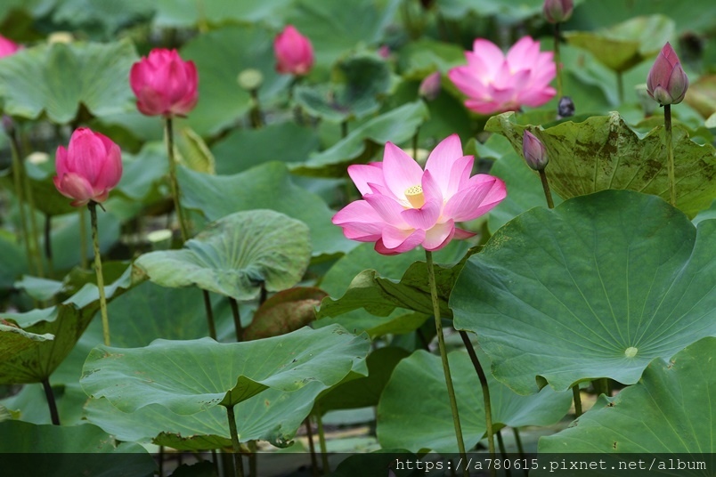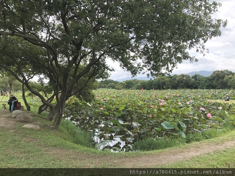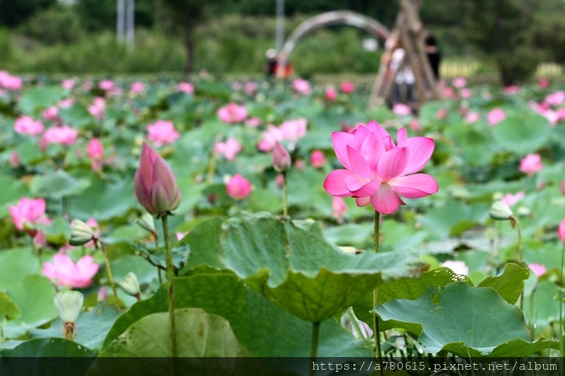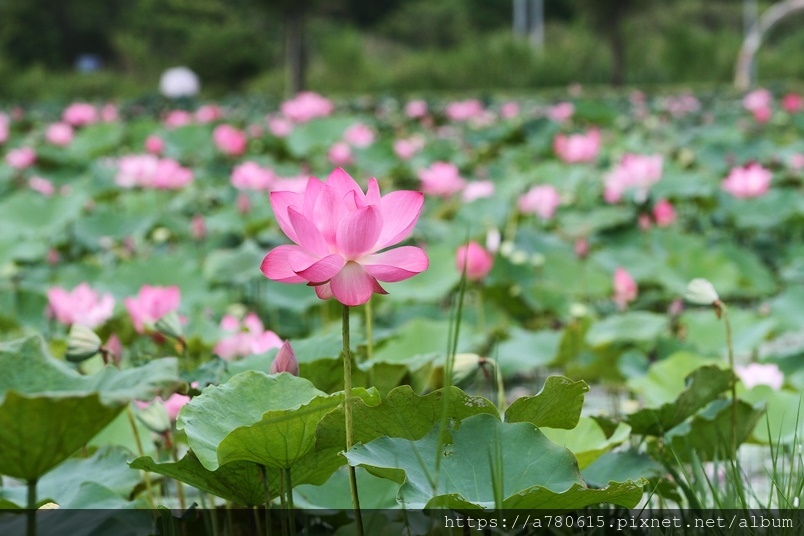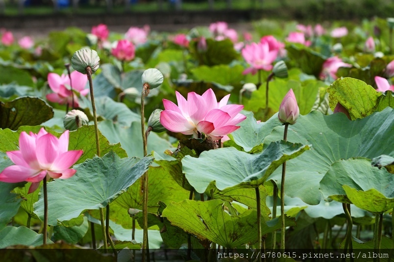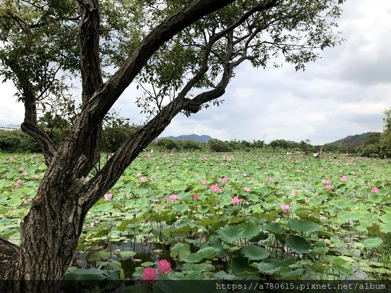 的柑園河濱公園,大片池塘上鋪滿粉色荷花,放眼望去十