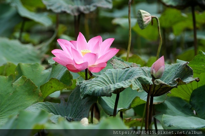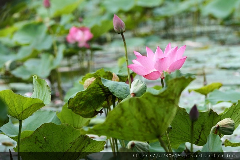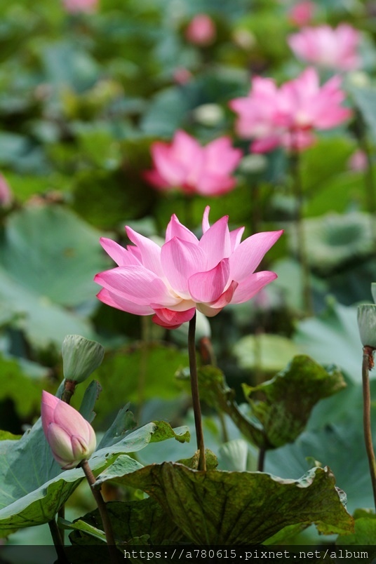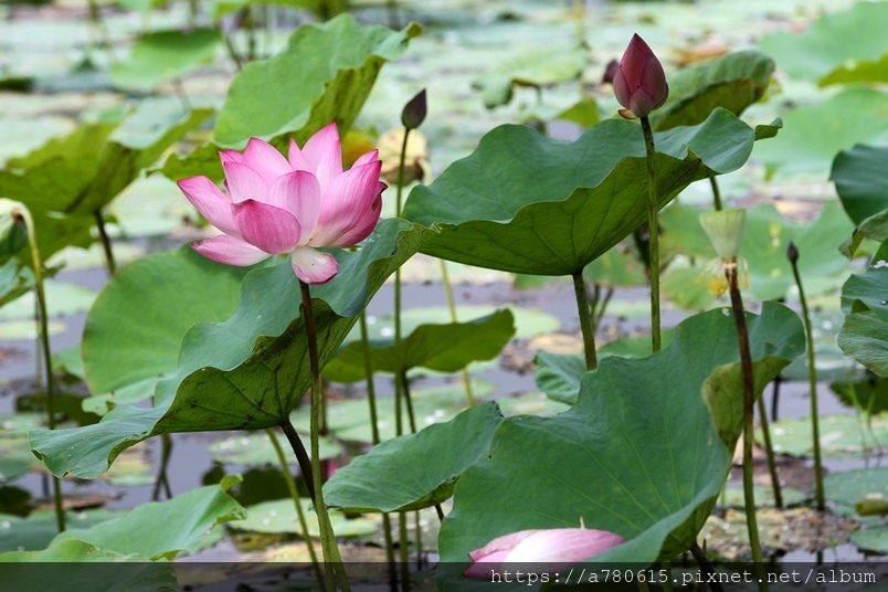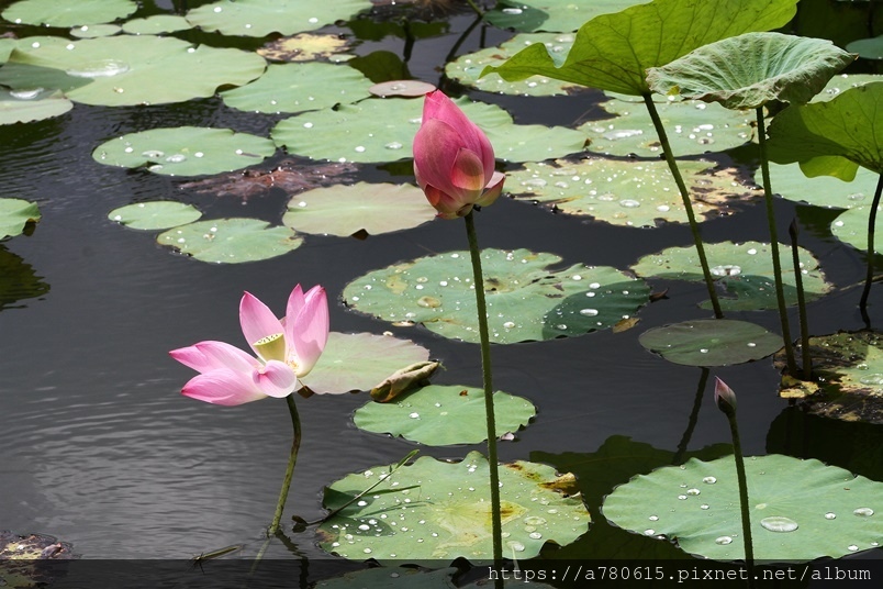 小徑分為兩大區塊,分別種植睡蓮及荷花,粉嫩荷花映襯