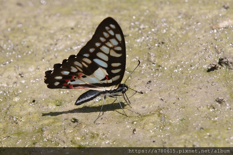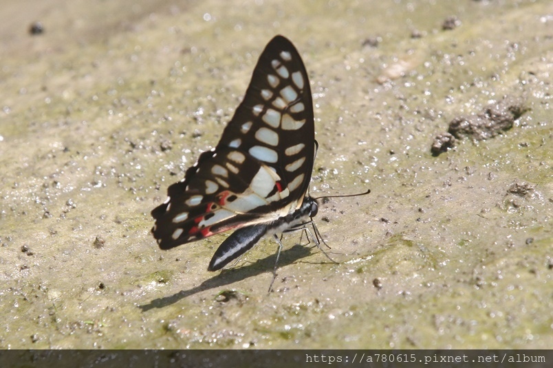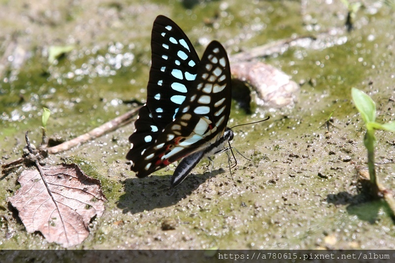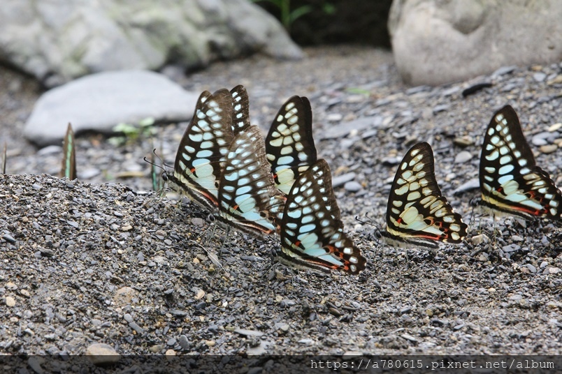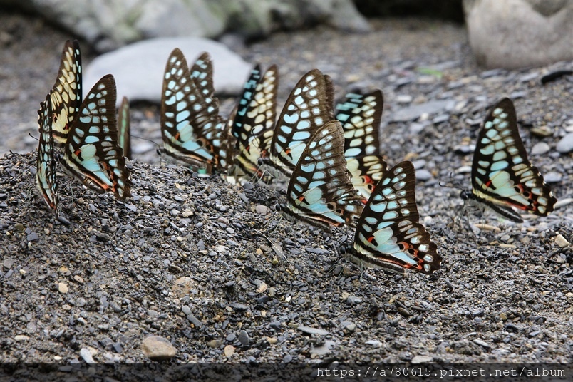 在雄蝶們喜歡群聚在溪流旁的濕地吸水,因此花點